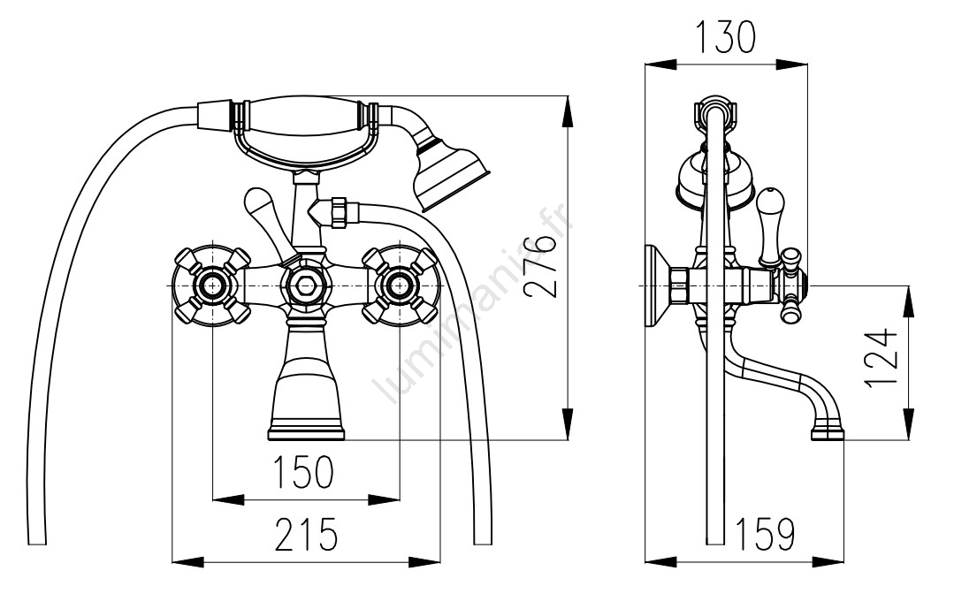• Ensemble de baignoire comprenant un mitigeur mural pour baignoire avec un support en fourche pour poser la douchette et une douchette.