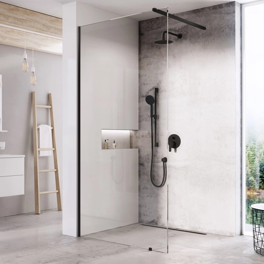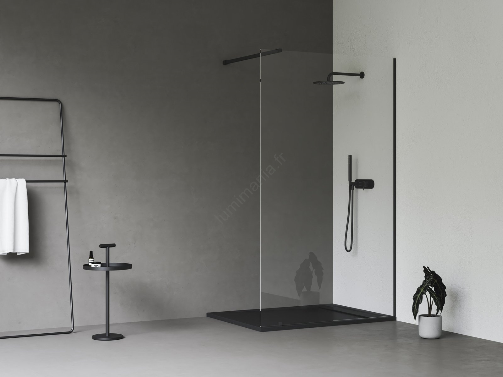 • La cabine de douche Walk-In Wall en finition noire offre une entrée moderne et épurée, ajustable jusqu'à 120 cm de largeur.