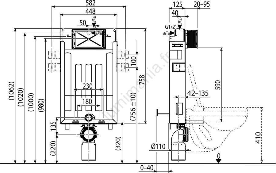 • Module de base pour WC suspendu, avec entraxe de raccordement 180 ou 230 mm, destiné à l'encastrement et à l'habillage.
