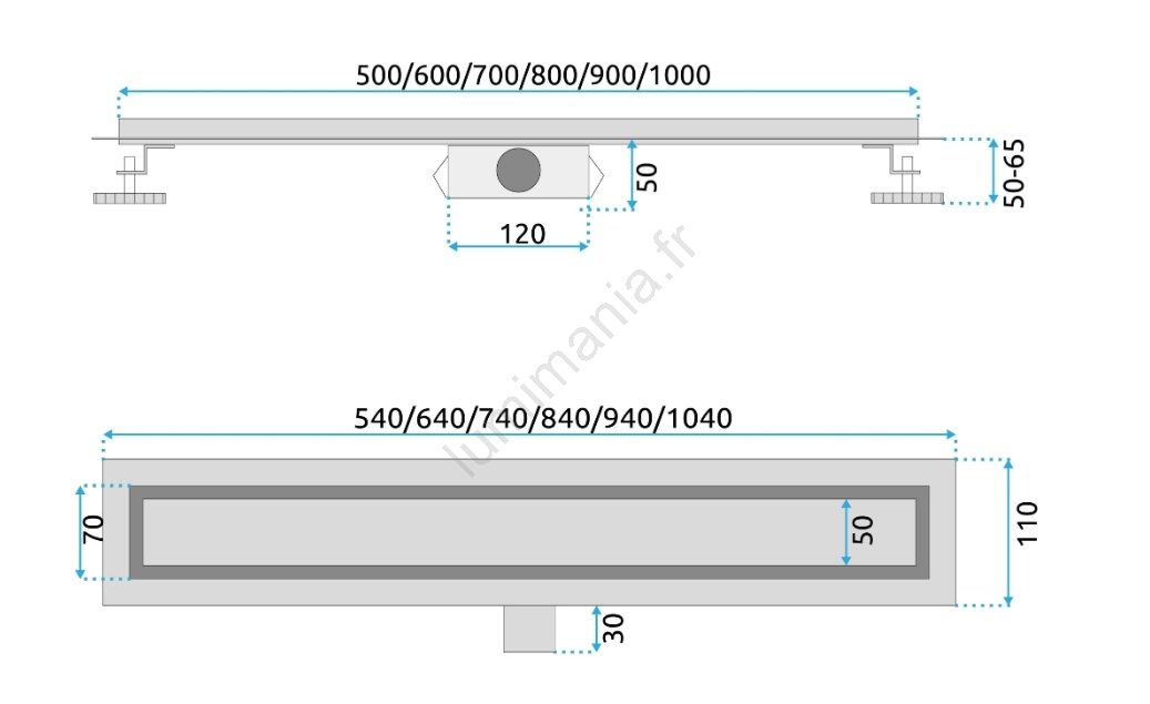 • Caniveau linéaire de 80 cm, finition aspect inox.