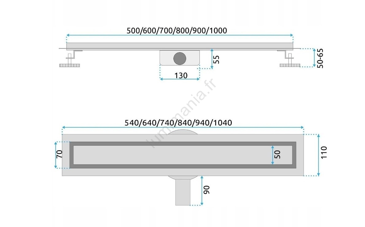 • Grâce aux pieds réglables en hauteur (50–65 mm), le caniveau s'adapte facilement à différents niveaux de sol.