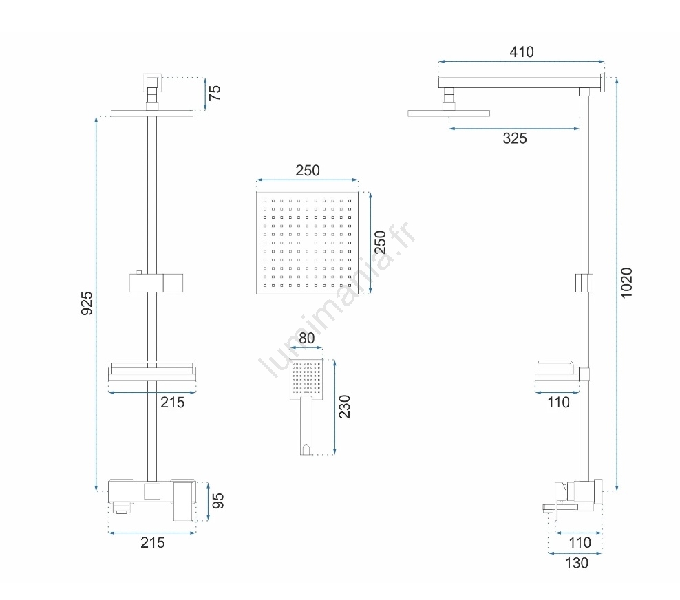 • Contenu de l'emballage : douchette à main et tête de douche, support pour douchette, porte-savon, mitigeur avec cartouche et flexible de 150 cm.