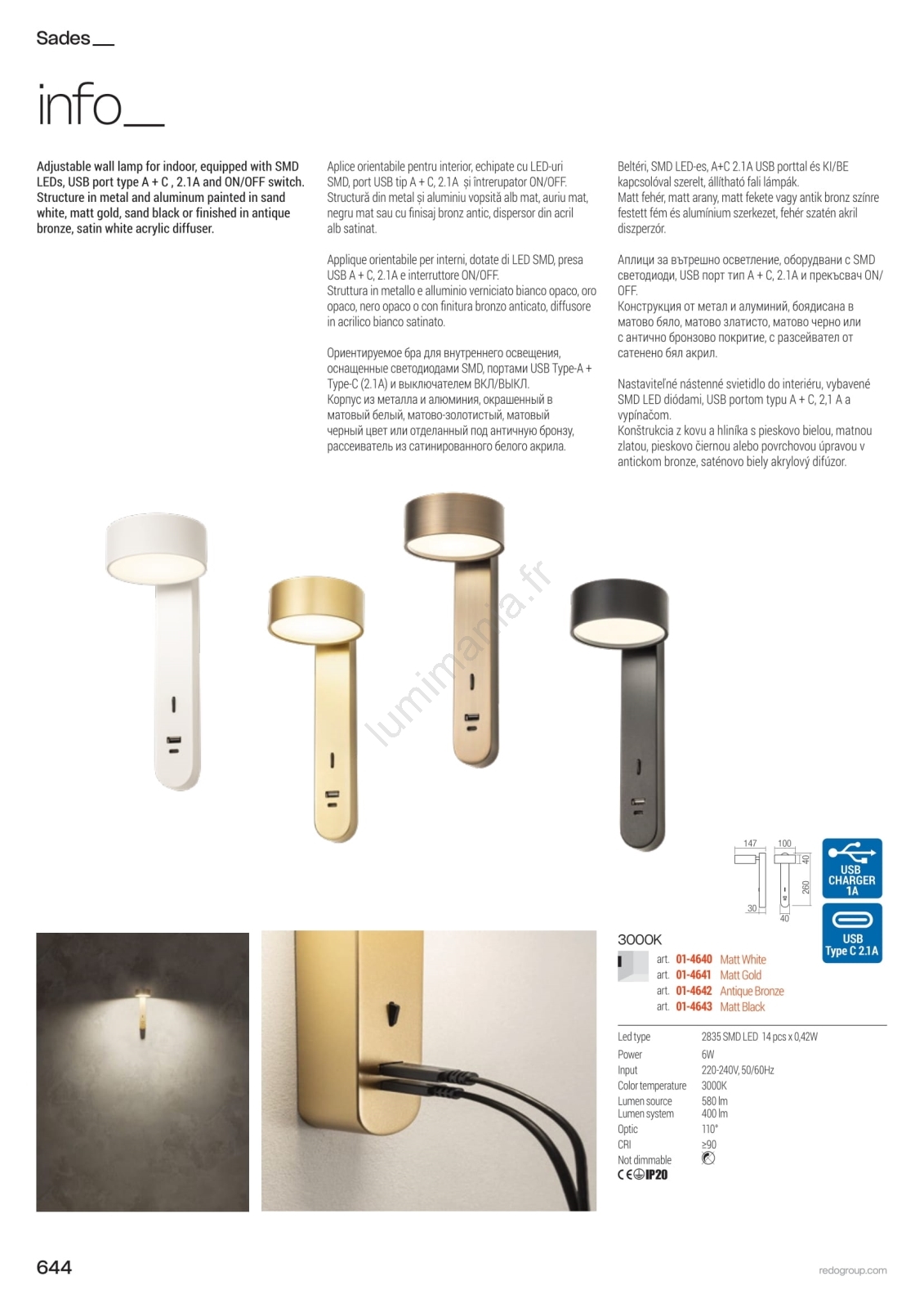 • Redo 01-4643 - Applique murale LED SADES, 6 W, 230 V, IRC 90, port USB, noir