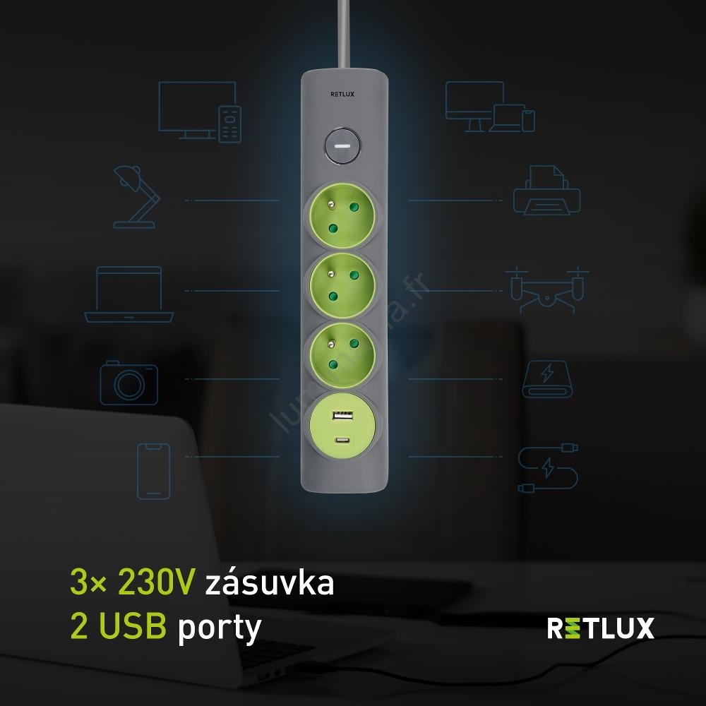 Retlux - Rallonge multiprise 3 prises Type E avec interrupteur + 1x USB-A + 1x USB-C, 1,4 m, gris