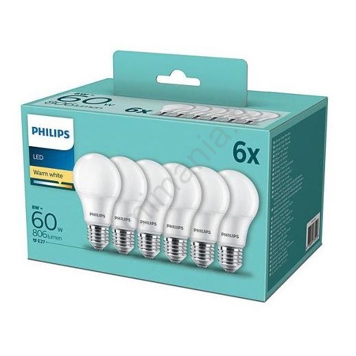 PACK 6x Ampoule LED Philips A60 E27/8W/230V 2700K Son design de qualité supérieure assurera un éclairage parfait de votre intérieur. La catégorie E27 est dédiée aux ampoules ayant le même culot. Dans notre boutique en ligne, vous avez le choix entre des ampoules à filament traditionnel et des ampoules LED modernes, plus économes en énergie et d'une durée de vie plus longue.