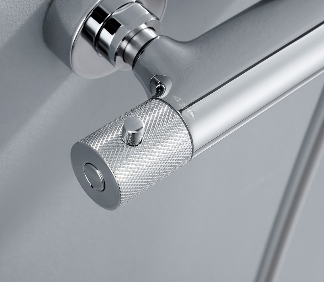 • La colonne de douche présente des lignes épurées et des détails au style industriel.