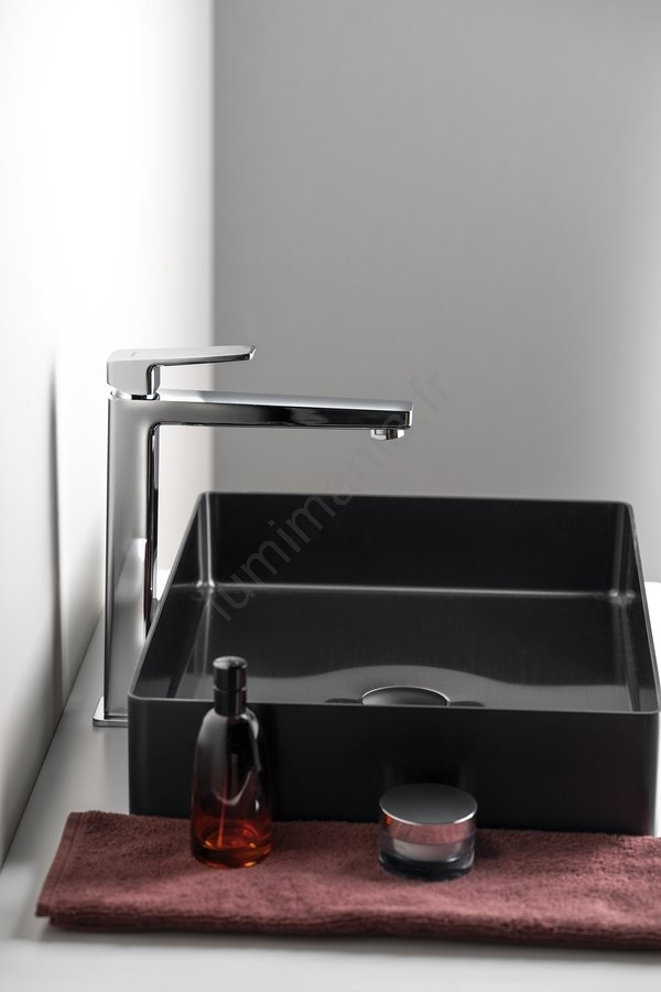 • Ce mitigeur pour lavabo est fabriqué en laiton et présente un design moderne et carré.