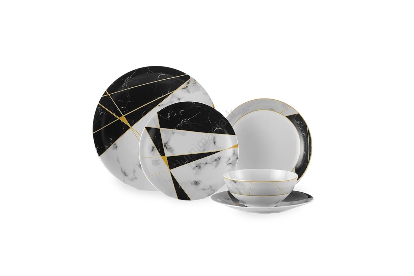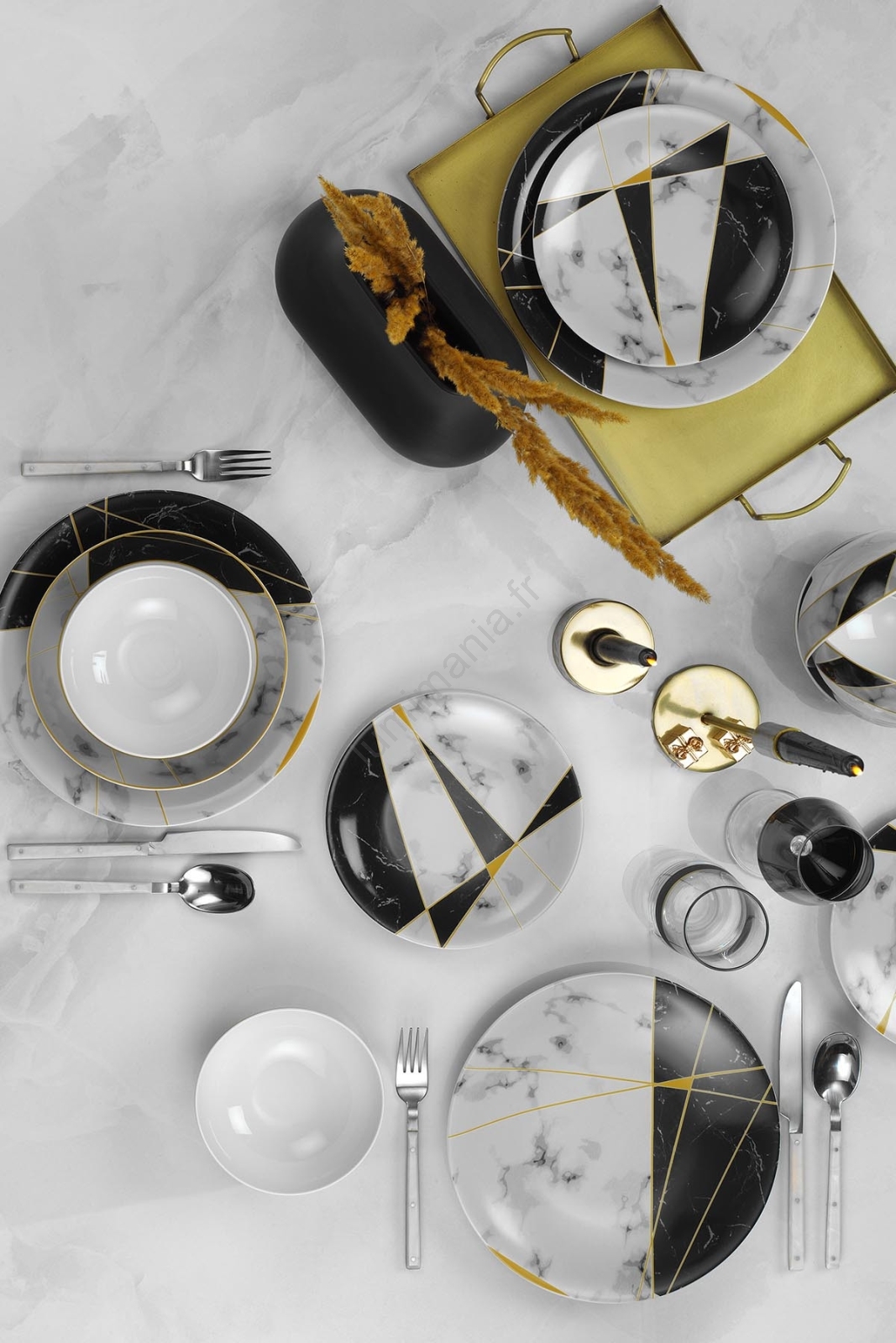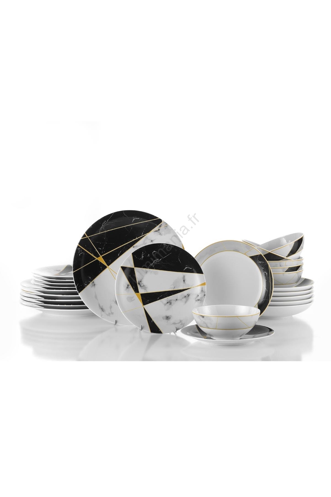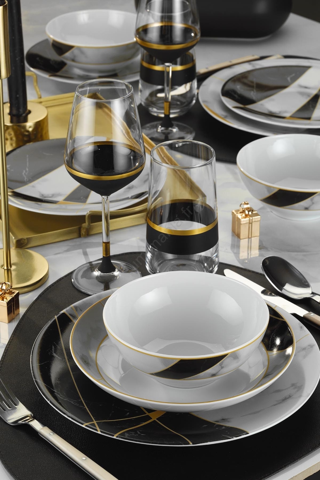 Service de table 24 pièces en porcelaine, noir/blanc/doré