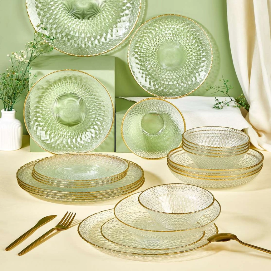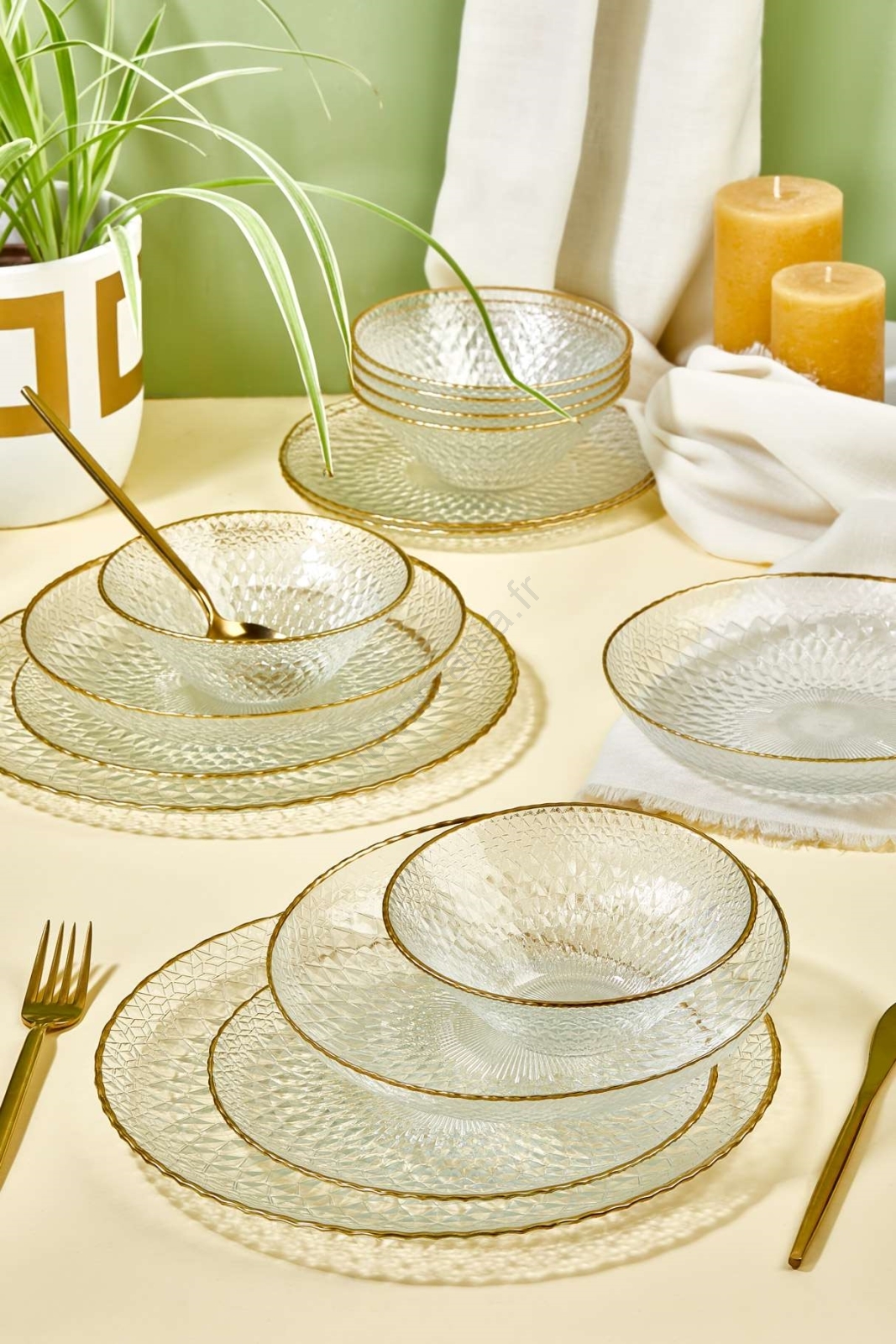 Service de table 24 pièces en verre transparent avec finitions dorées