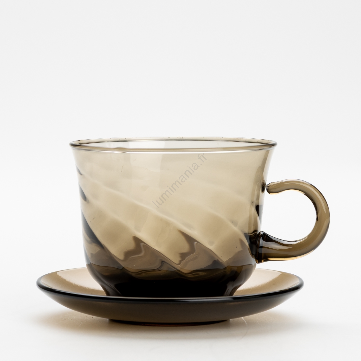 Set de 6 tasses en verre avec soucoupes et 1 sucrier fumé