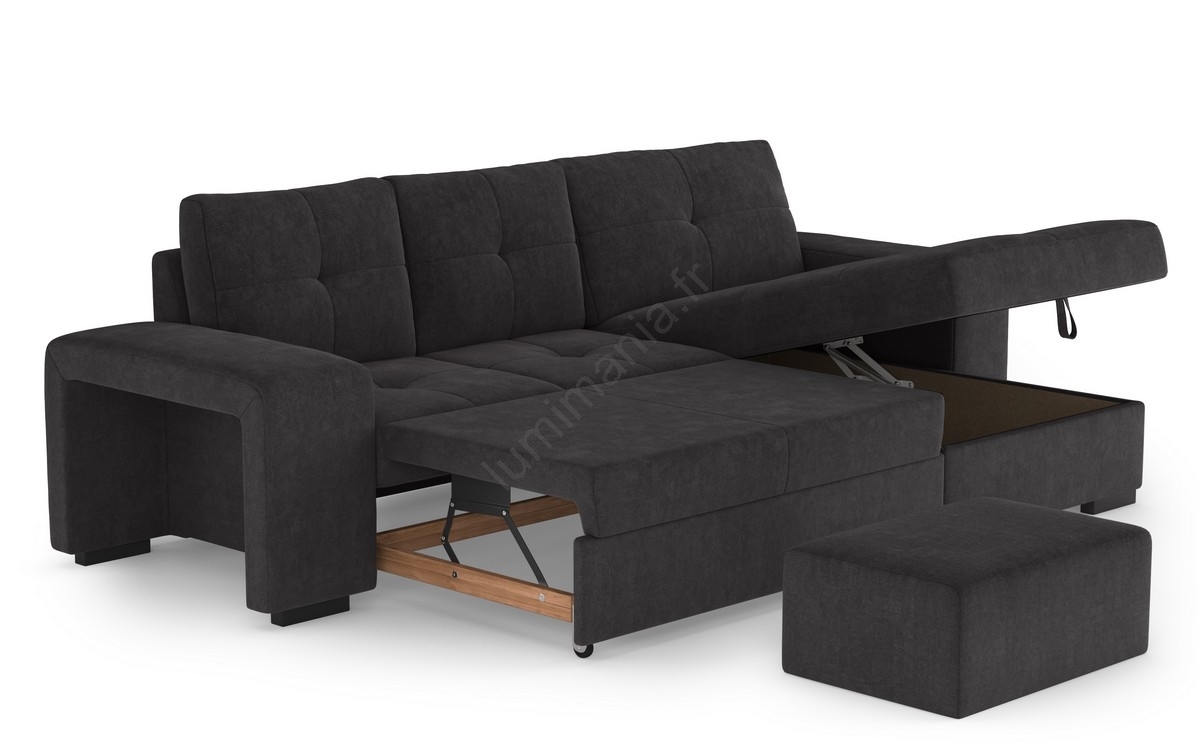 Canapé-lit PALERMO avec coffre de rangement et pouf, noir, version droite