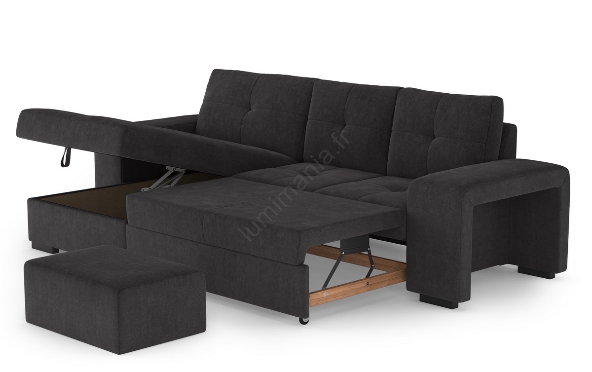 Canapé convertible PALERMO avec coffre de rangement et pouf, noir, version gauche