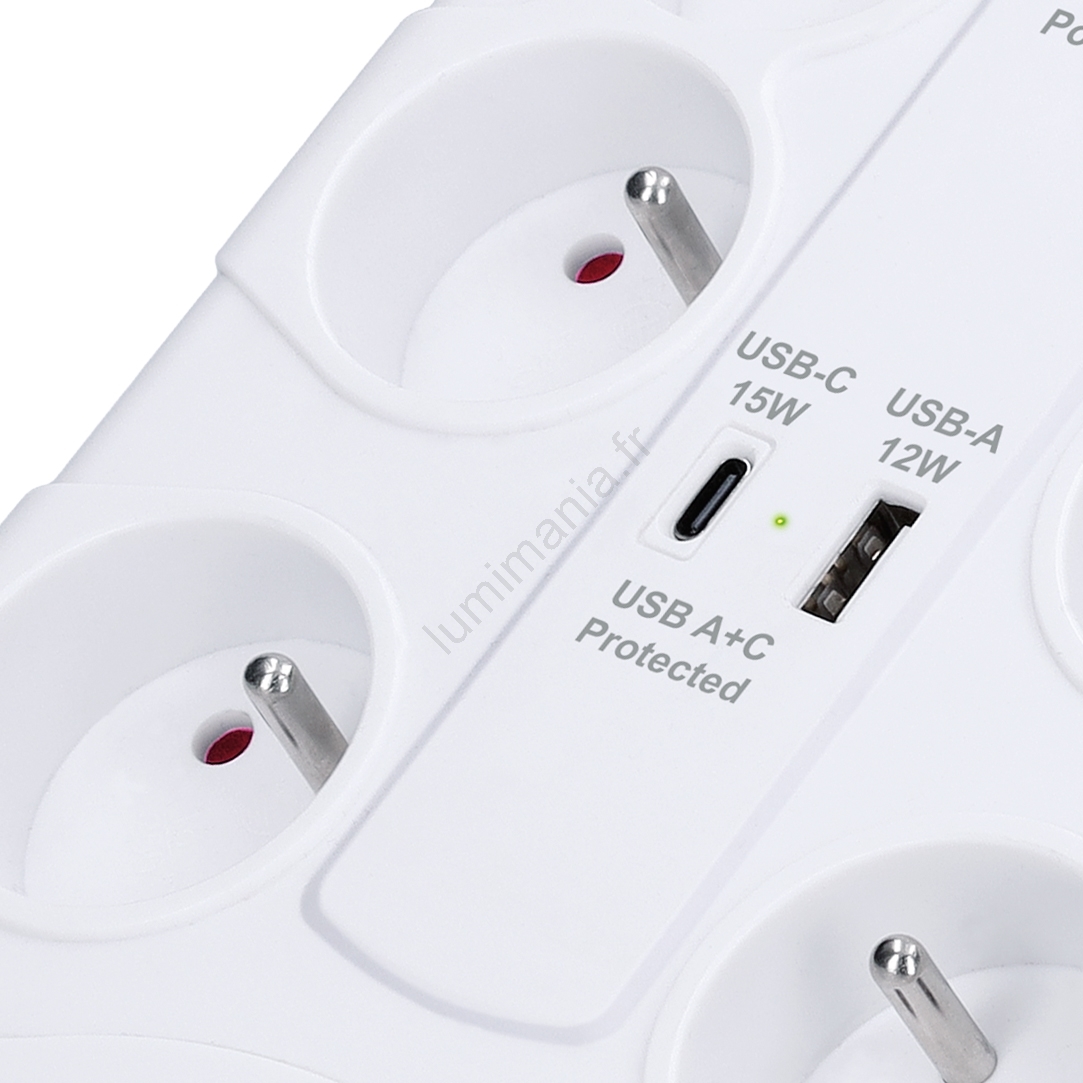 • Indicateurs LED : protection contre les surtensions active, prises 230 V protégées, ports USB A + C protégés.