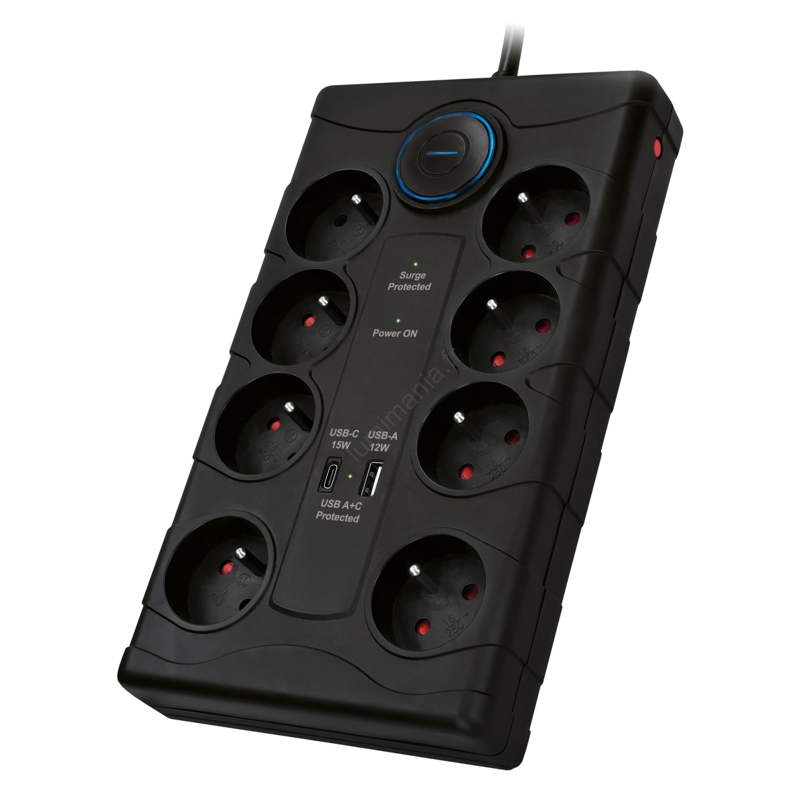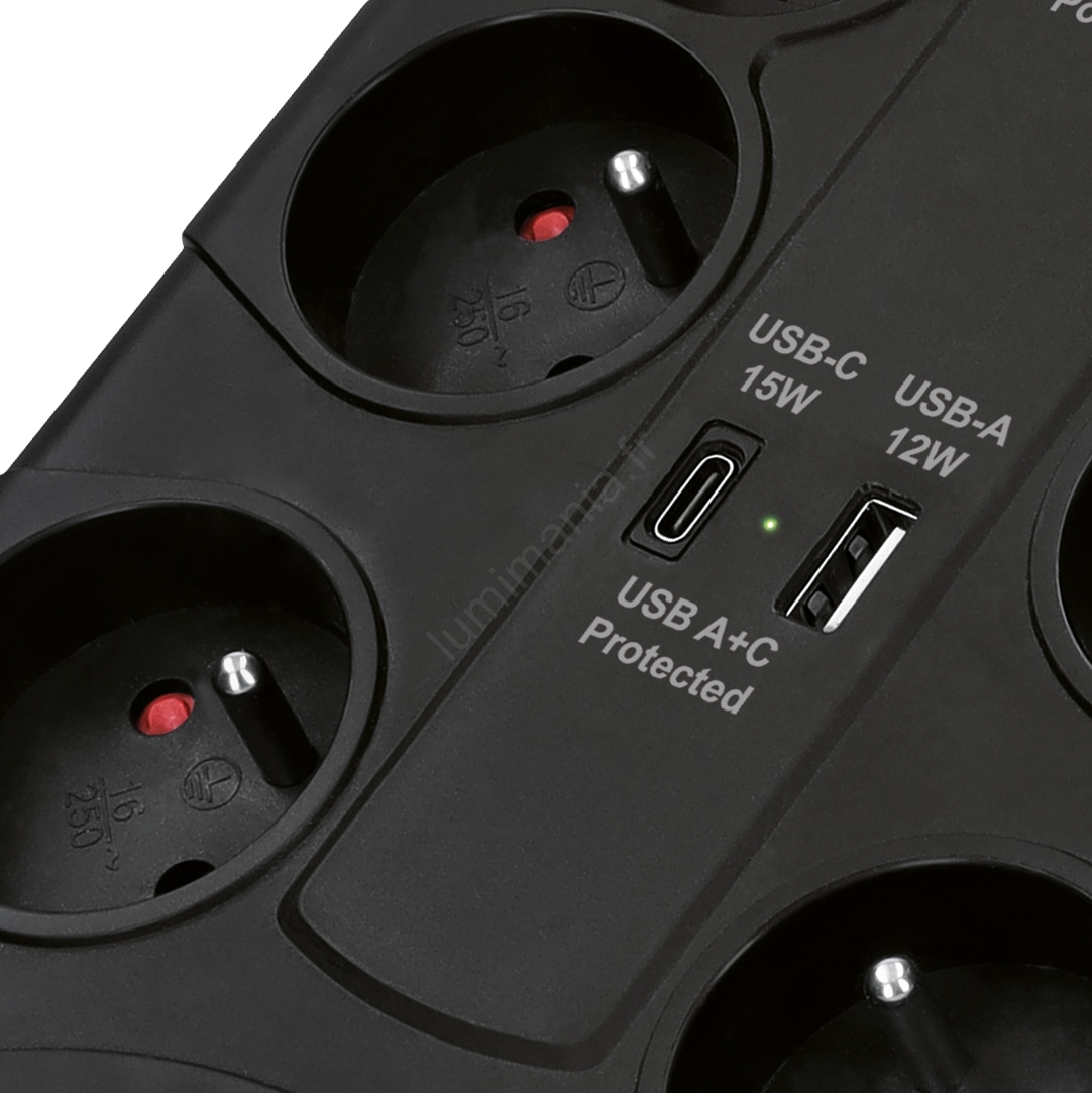 • Indication LED : protection contre les surtensions active, prises 230V protégées, ports USB A + C protégés.