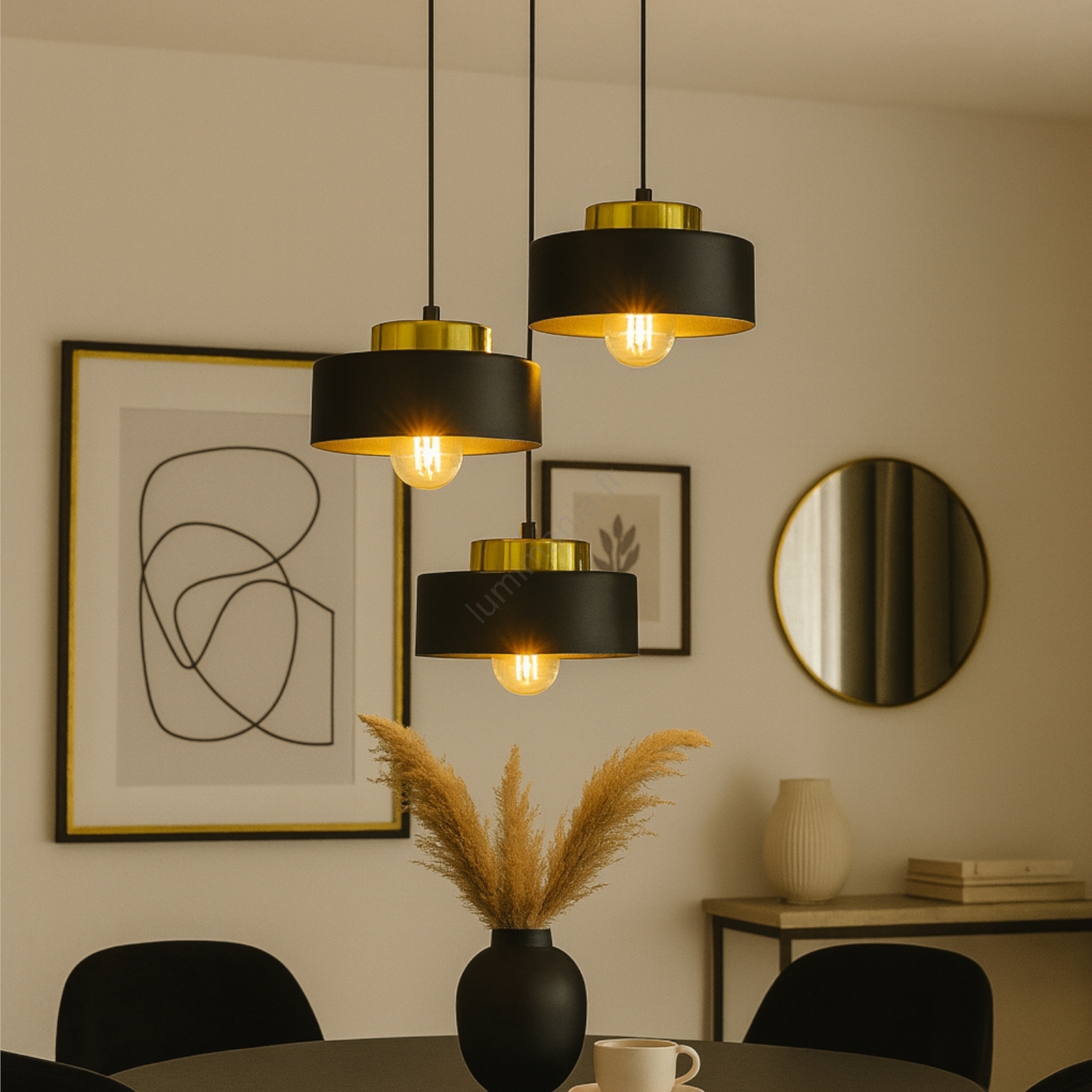 Suspension sur câble IGNIA 3xE27/60W/230V noir/doré caractérise un design agréable et fonctionnel.  Une ampoule à culot E27 convient pour ce luminaire. Ici, vous pouvez acheter d'autres ampoules à des prix avantageux. Vous aurez un ajout intéressant dans votre intérieur.