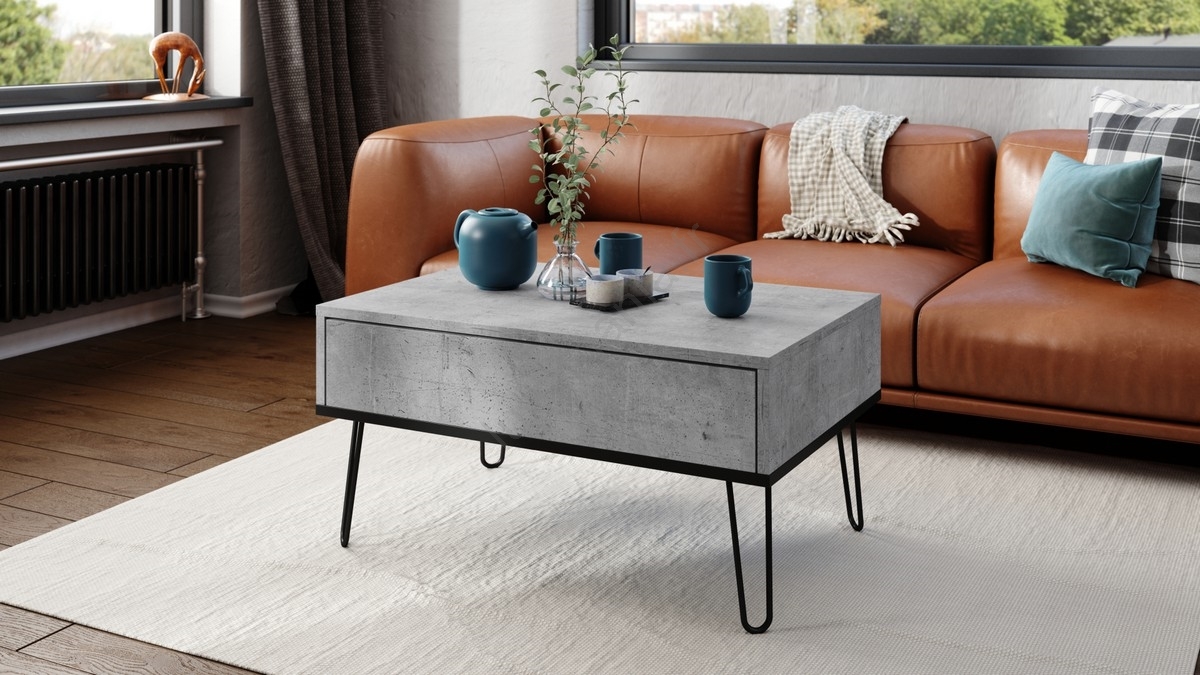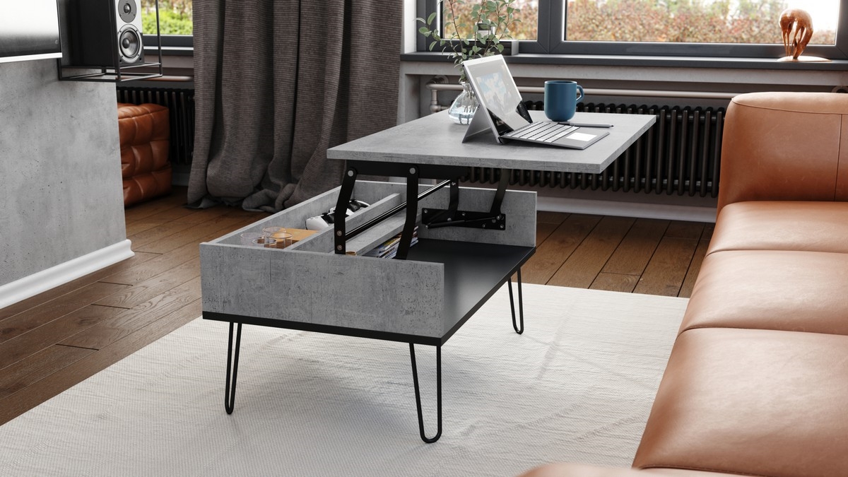 • Table basse HALIJA avec plateau relevable et tablette gris béton/noir