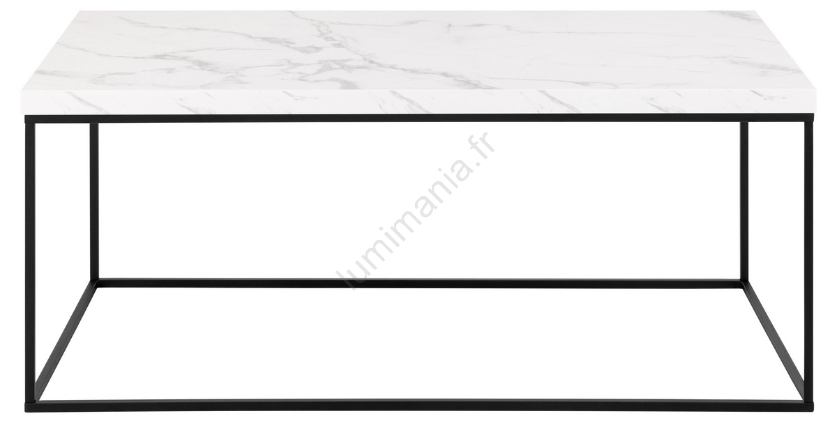 • Plateau en marbre blanc de Carrare recouvert d'un mélaminé à texture brute, piètement en acier peint par poudrage noir mat à finition rugueuse.