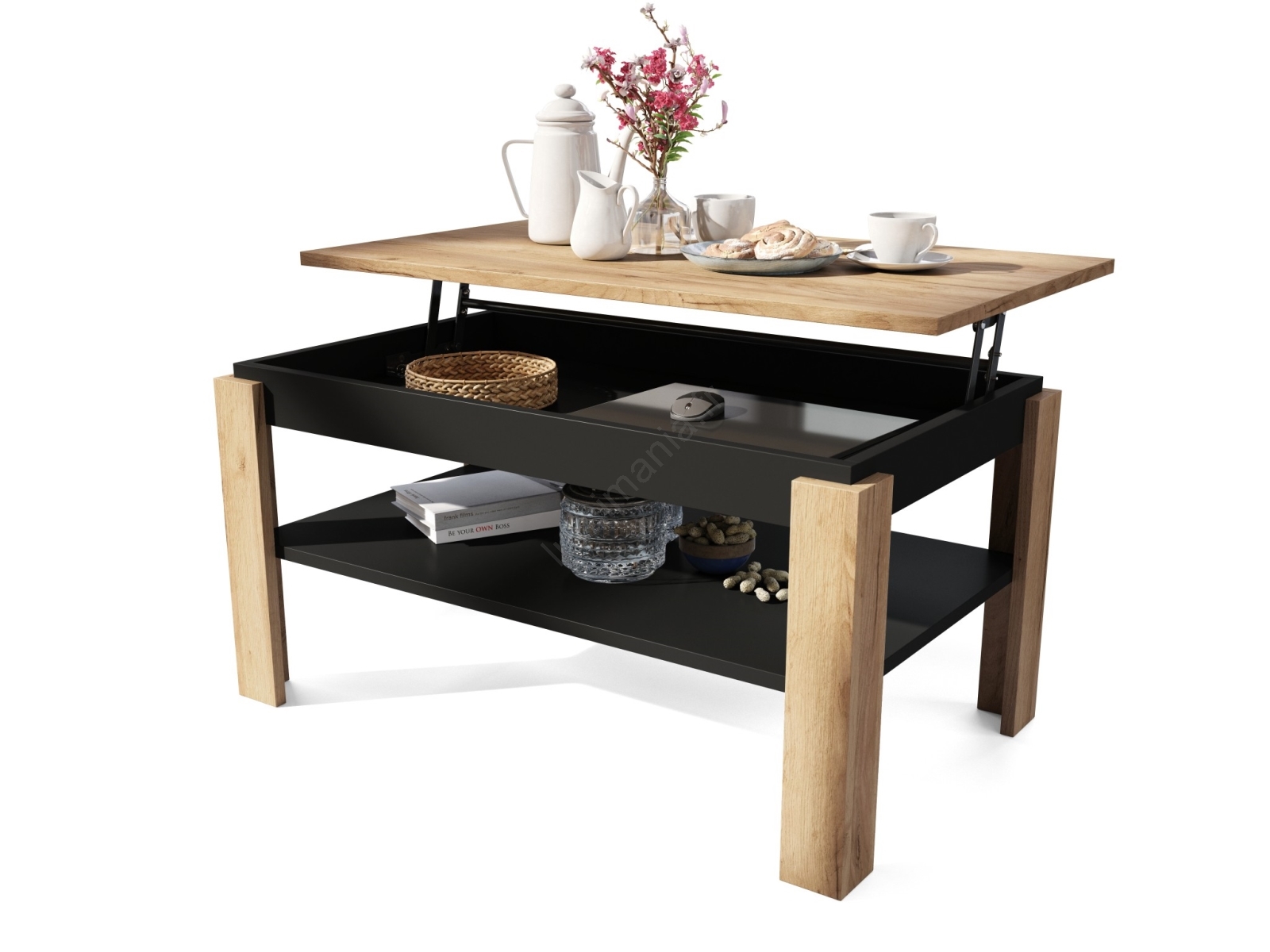 Table basse extensible avec plateau relevable et étagère ADEN chêne craft/noir