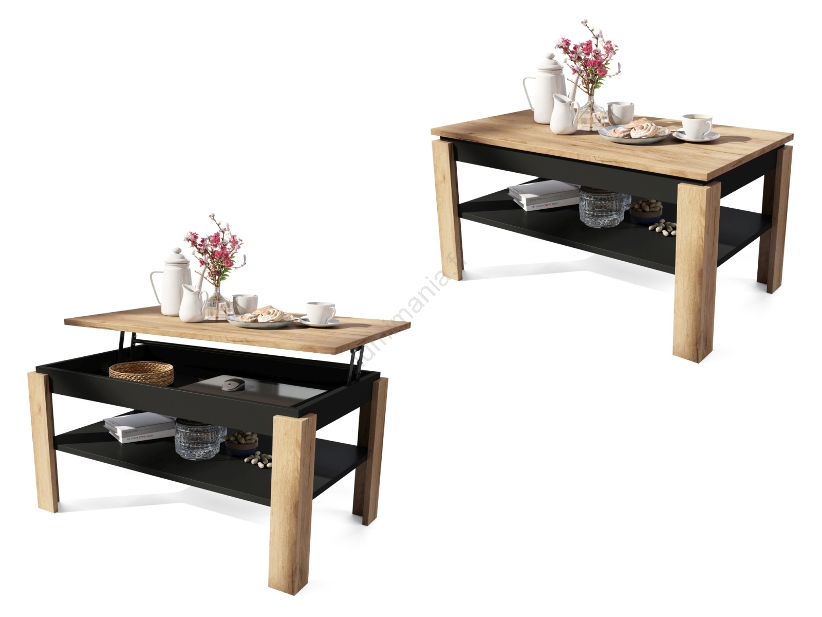 • Table basse extensible avec plateau relevable et étagère ADEN chêne craft/noir