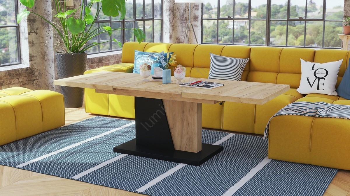 • Table transformable basse/à manger NINO avec plateau relevable chêne craft/noir