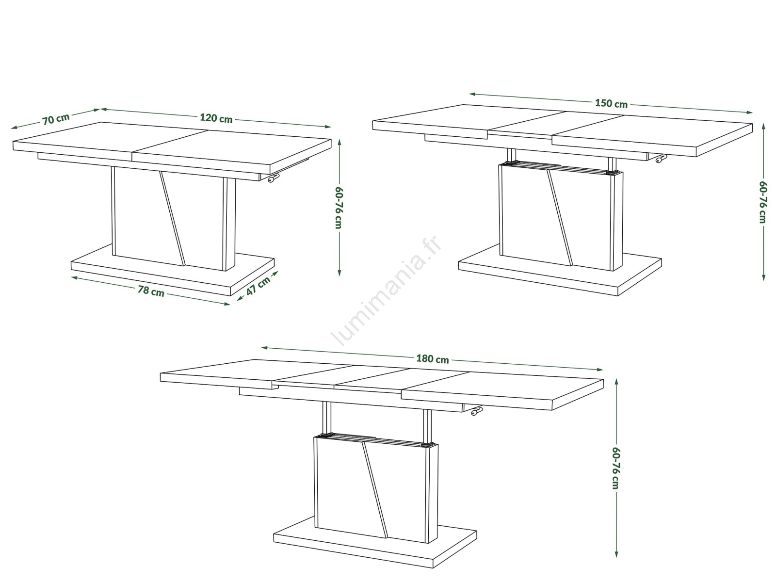 • Grâce à deux rallonges de 30 cm, le plateau peut être agrandi à 150 ou 180 cm.