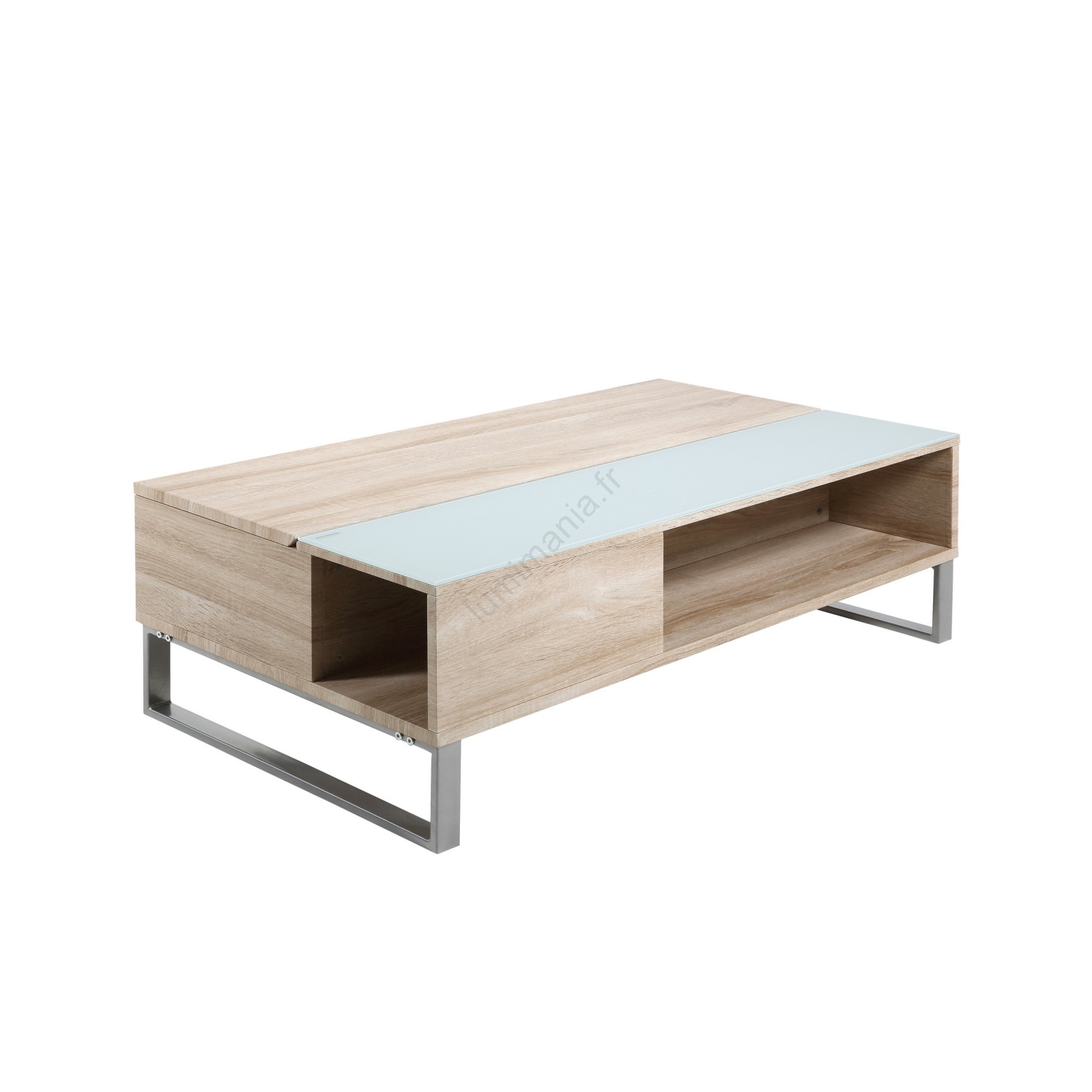 • Le plateau combine verre trempé blanc et panneau de particules finition chêne Sonoma.