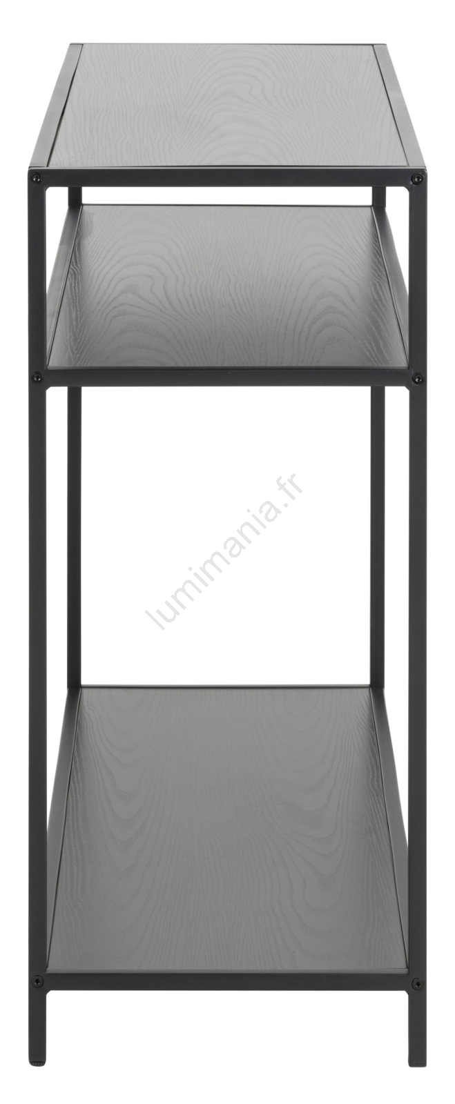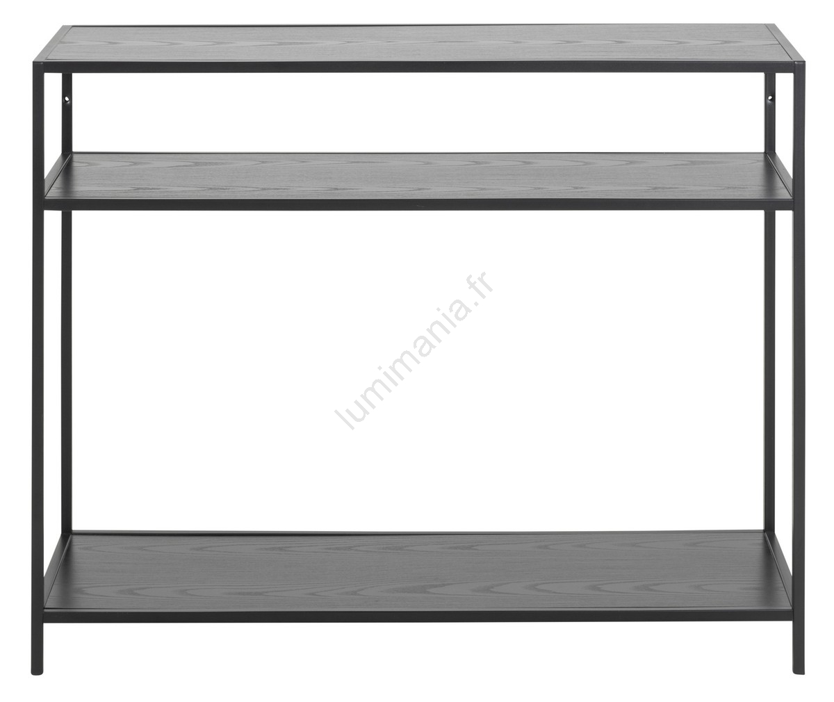 • Plateau et 2 étagères en mélamine noire à finition brute, piètement en acier thermolaqué noir mat.