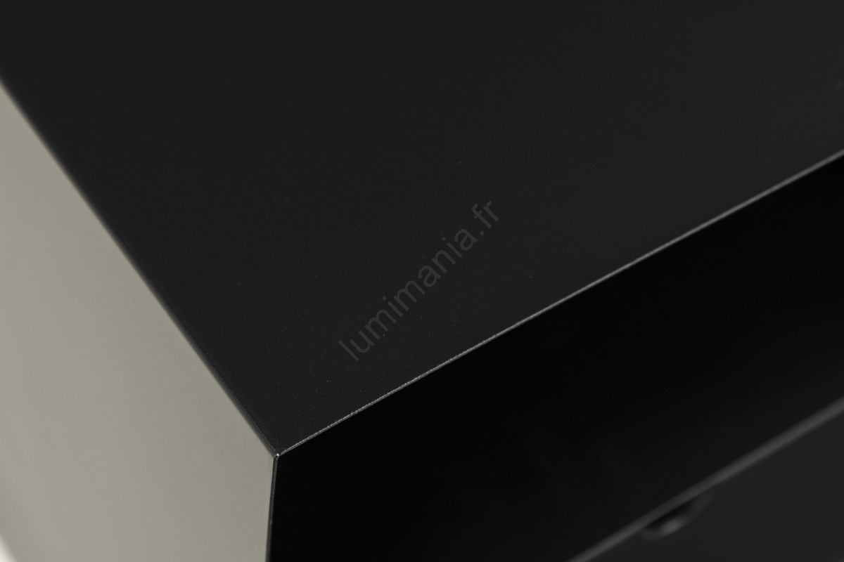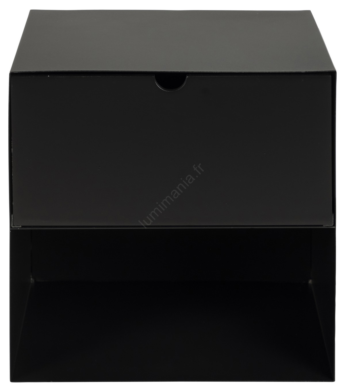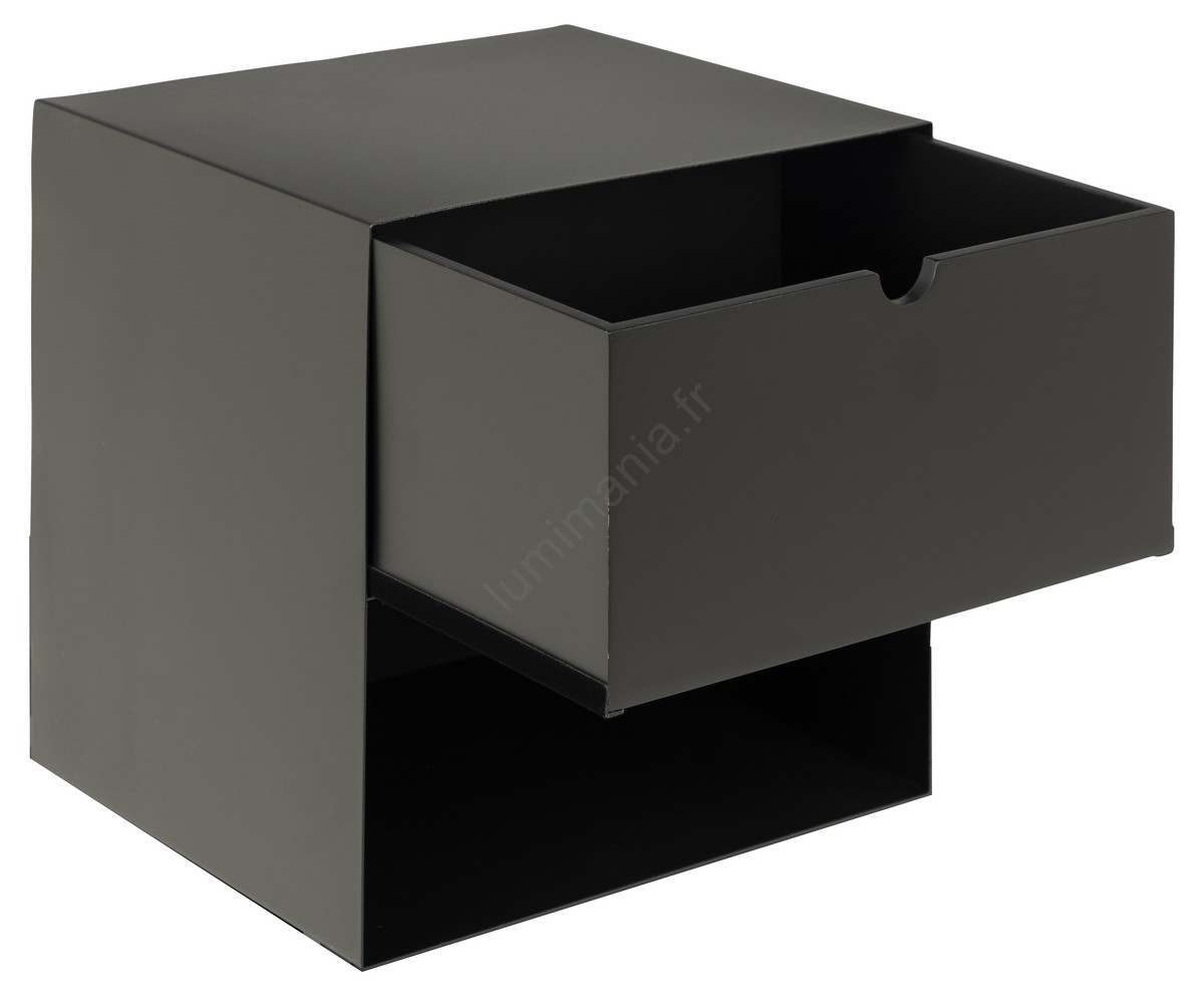 • Plateau et cadre en acier peint par poudrage noir mat à finition texturée, tiroir noir avec compartiment ouvert et fixation murale.