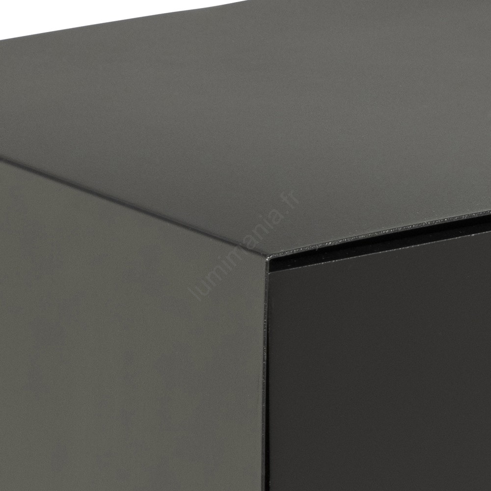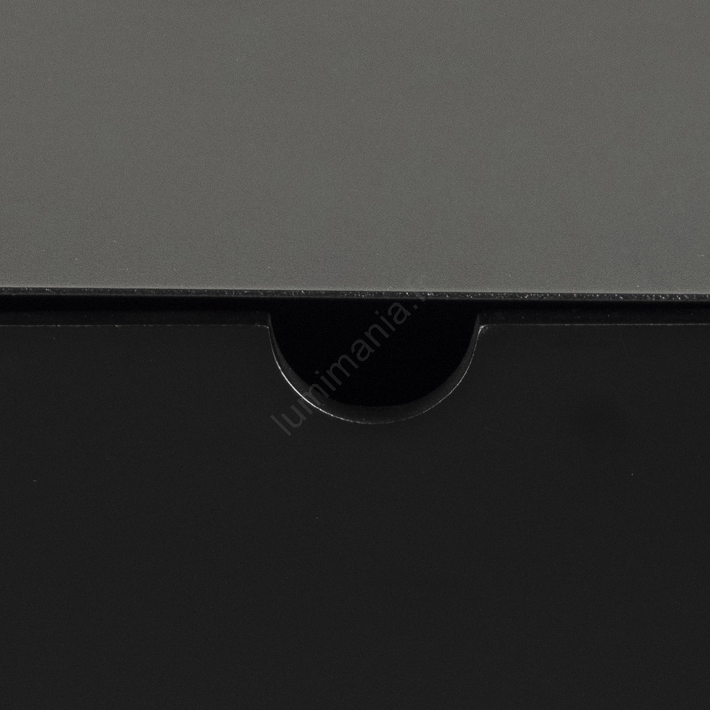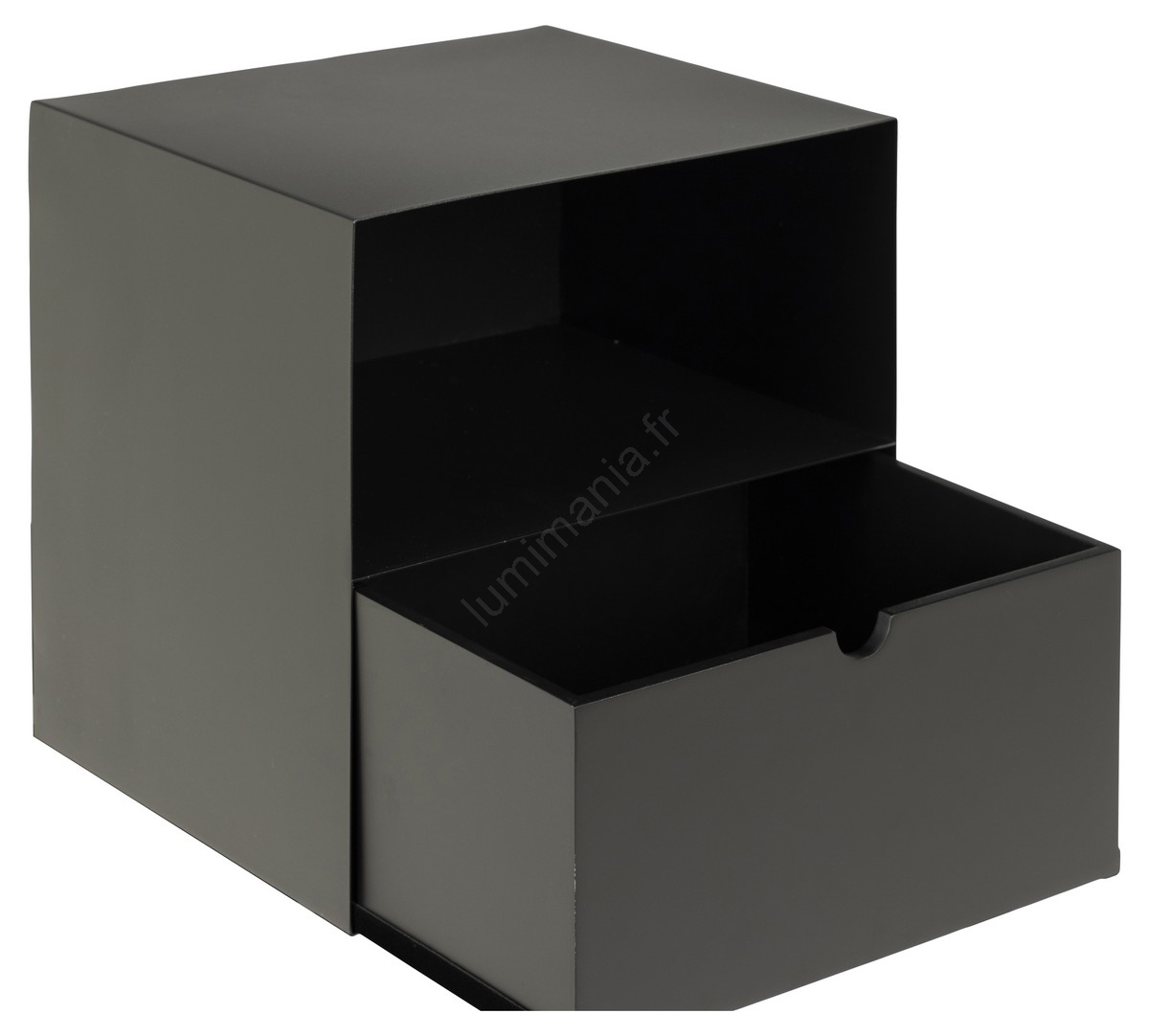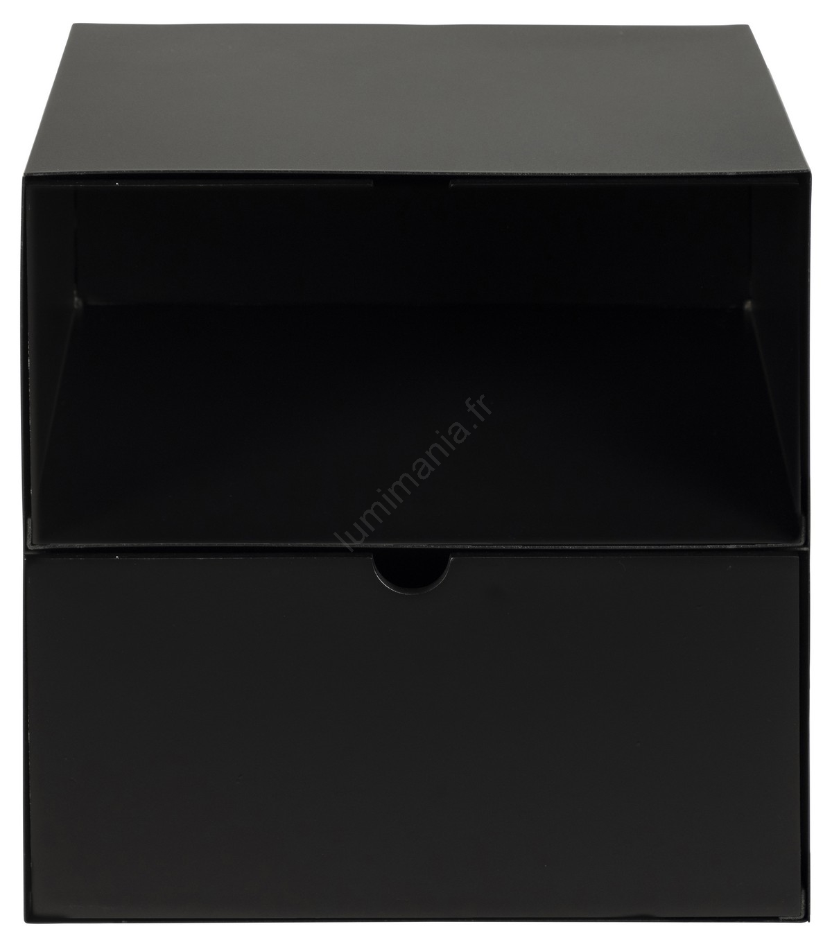 • Plateau et cadre en acier peint par poudrage noir mat à finition texturée, tiroir noir avec compartiment ouvert et fixation murale.