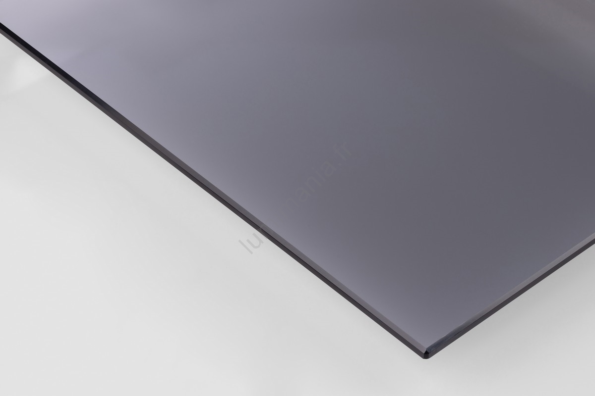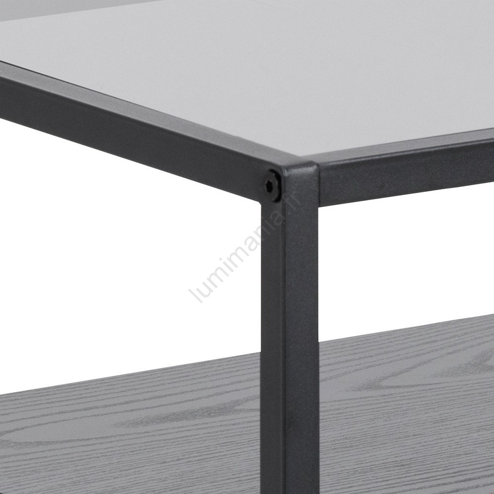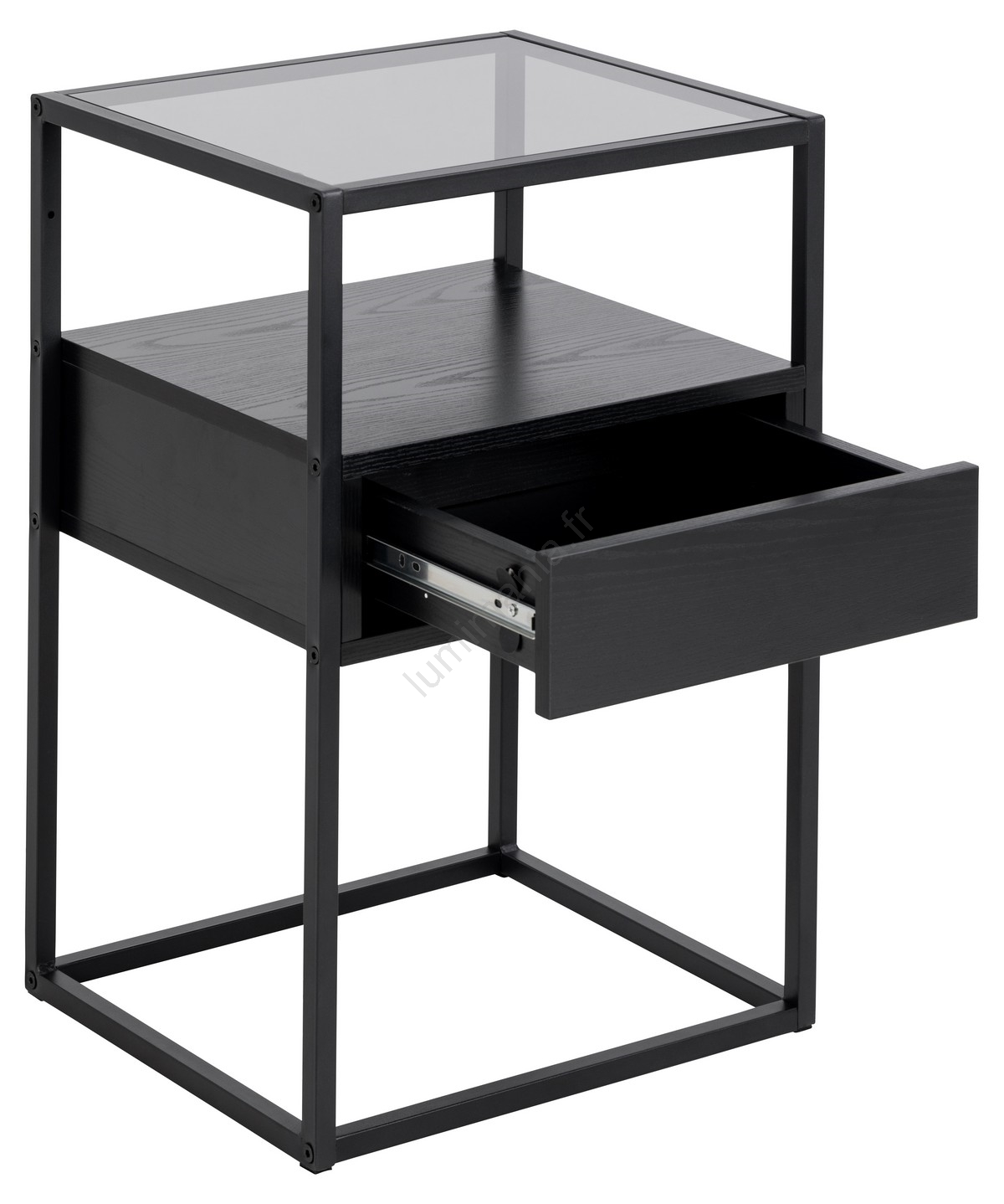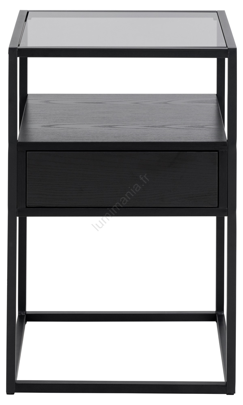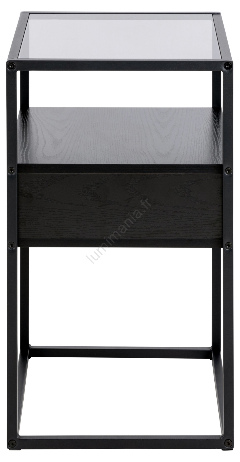 • Plateau supérieur en verre trempé fumé. Cadre, tiroir et étagère en mélamine noire à finition texturée, piètement en acier peint par poudrage noir mat.