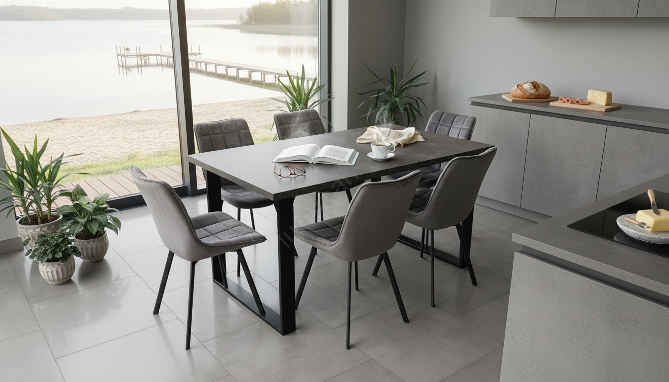 • La teinte grise confère à la table un aspect à la fois moderne et chaleureux.
