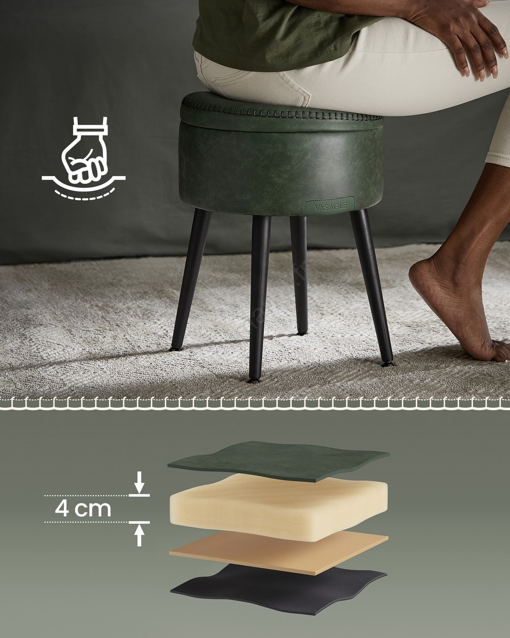 • L'intérieur du tabouret offre un espace (9,4 l) pour dissimuler appareils électroniques, livres, plaids et autres petits objets.
