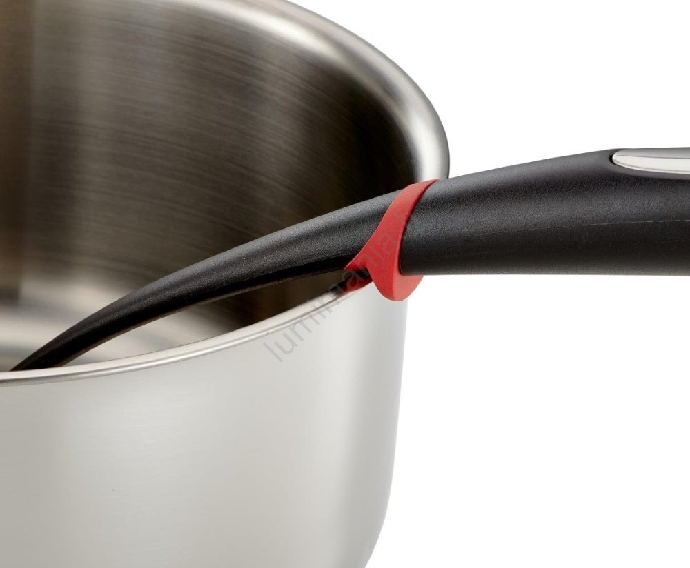 • Le manche est muni d'un anneau en silicone rouge qui permet à la louche de reposer sur le bord d'une poêle ou d'une casserole chaude.