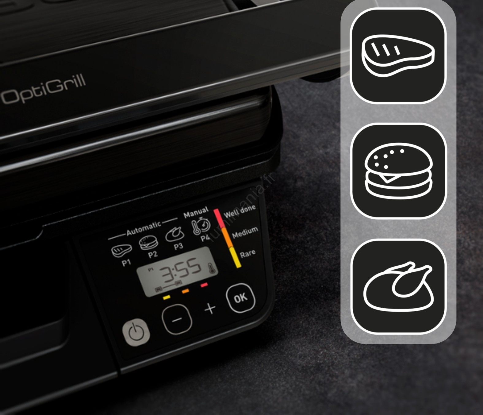 • Trois programmes automatiques (viande rouge, burgers, volaille) + mode manuel pour régler la température et le temps selon vos préférences.