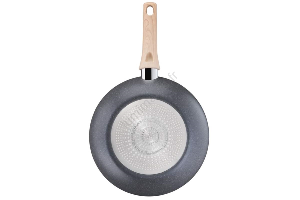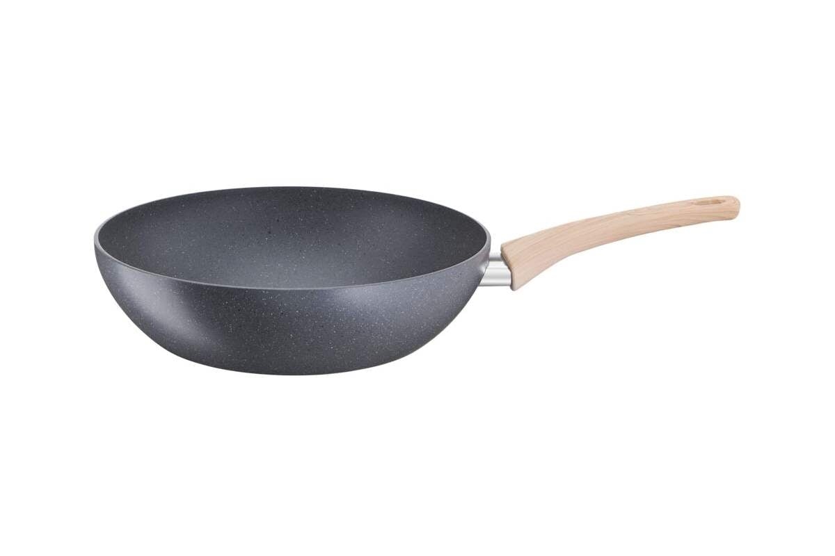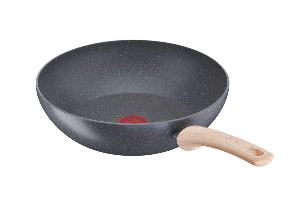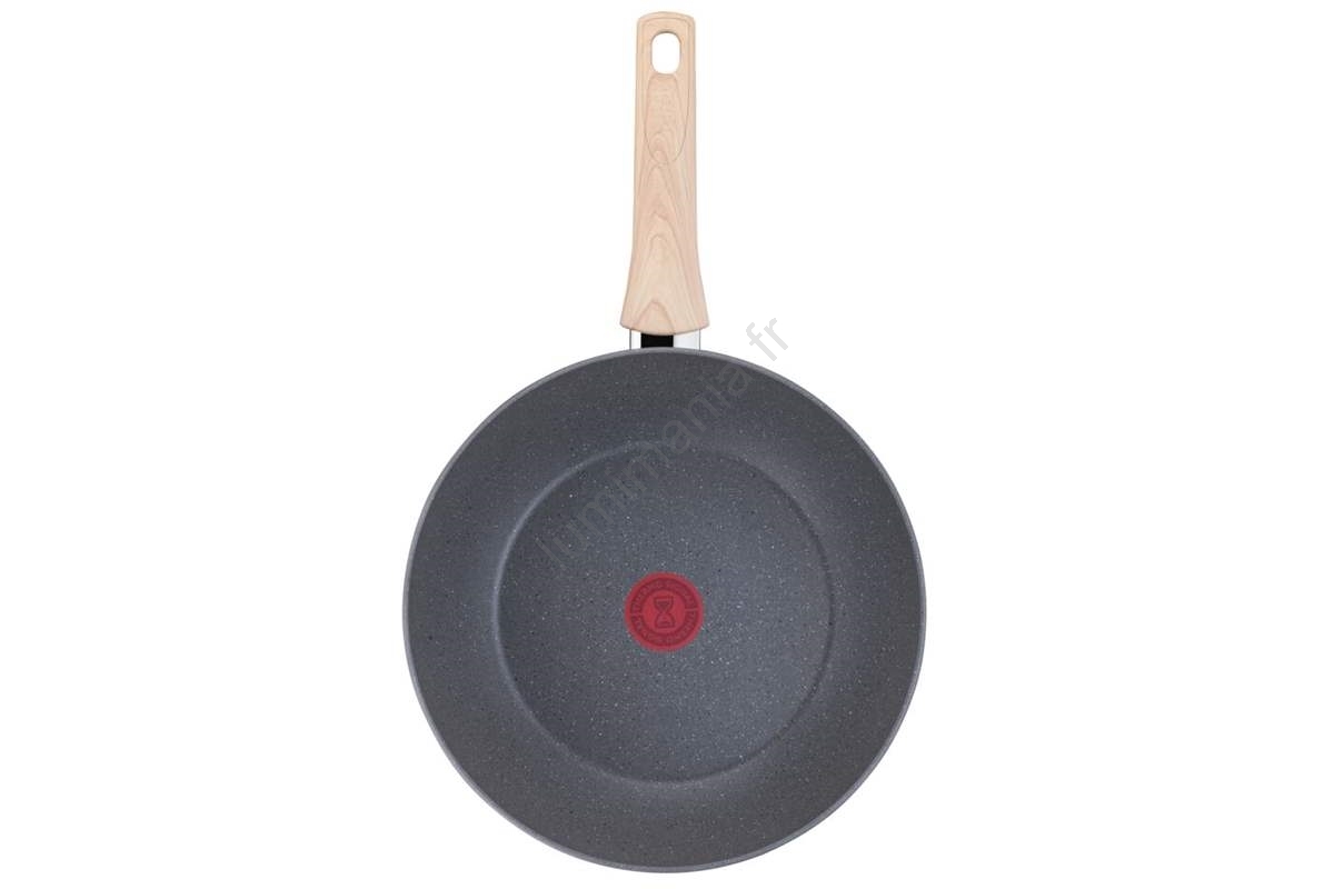 • Poêle wok profonde Tefal Natural Force avec un revêtement antiadhésif exceptionnellement résistant Mineralia+ à base de minéraux naturels, équipée d'une poignée imitation bois.