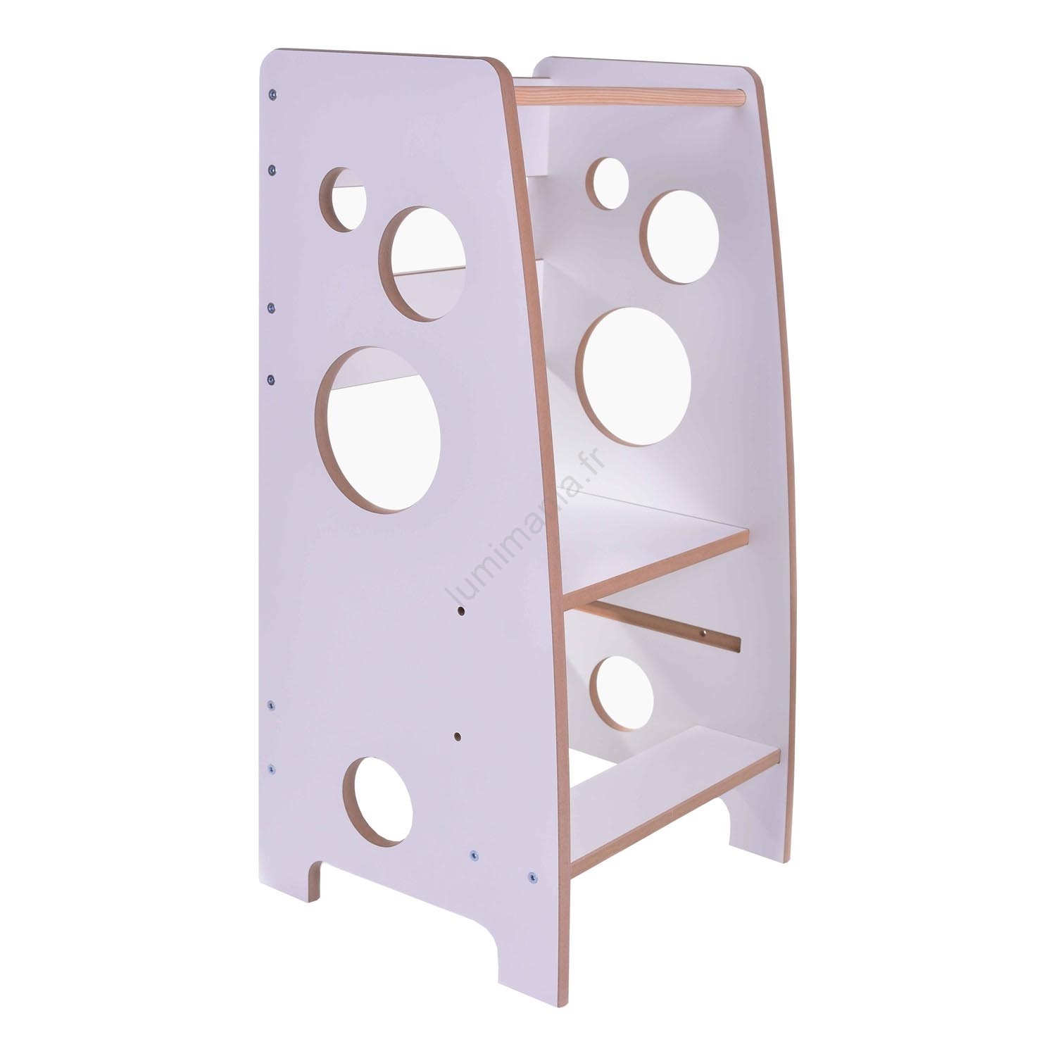 • La tour se compose d’une plateforme sur laquelle l’enfant se tient debout, d’une marche pour y accéder, et d’une barrière de sécurité tout autour.