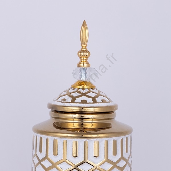 • La couleur dorée met en valeur les contours du motif et du couvercle, conférant à la vase un aspect luxueux et sophistiqué.