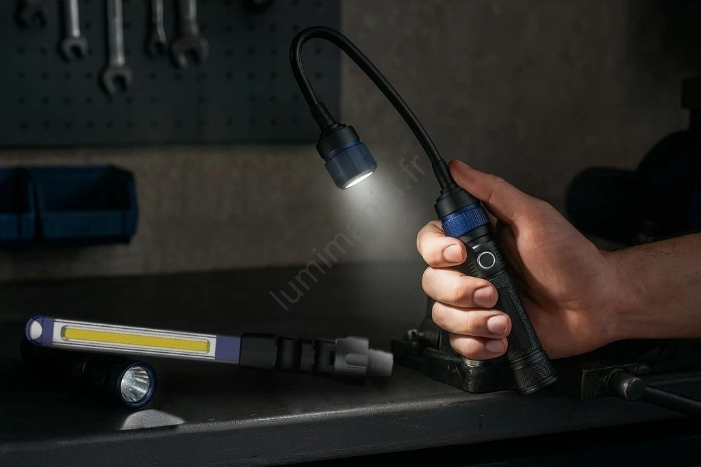 • La tête flexible de 190 lm, orientable pour ajuster la direction du faisceau, permet d'éclairer les zones difficiles d'accès.