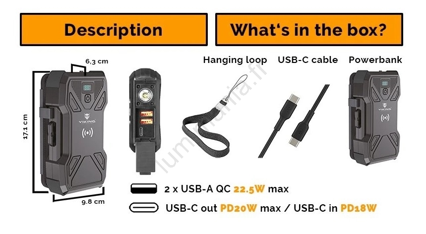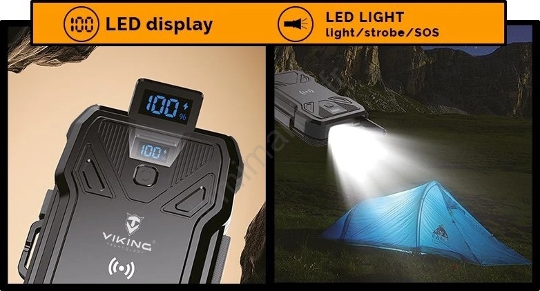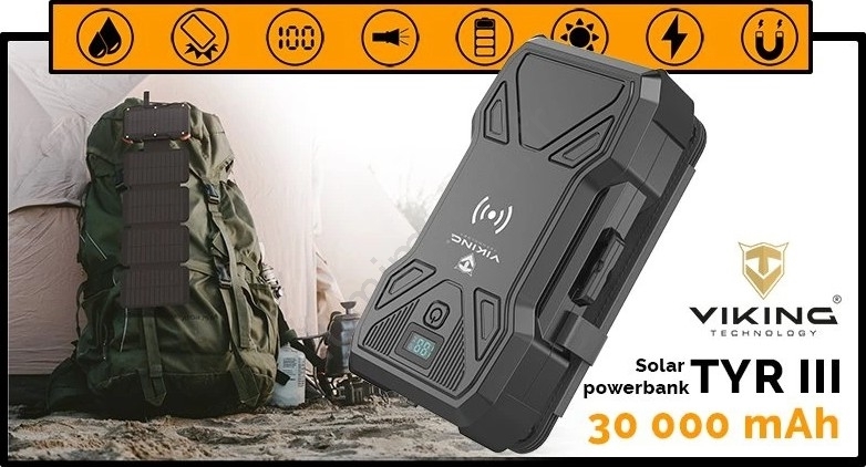 Viking - Batterie externe avec lampe LED, charge sans fil et panneau solaire Power Delivery 22,5W/30000 mAh