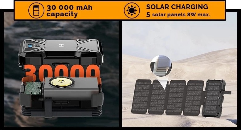 • Batterie externe d'une capacité de 30000 mAh, dotée de la recharge solaire et sans fil, et d'une lampe LED intégrée.
