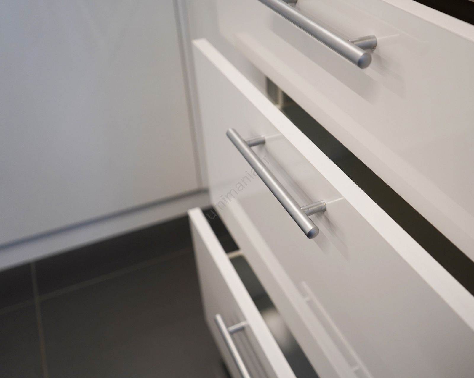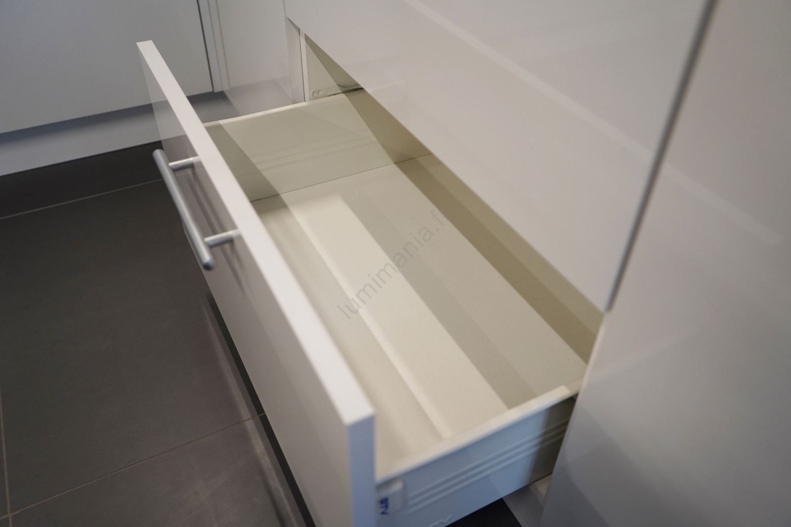 • Les éléments hauts sont équipés de vérins à gaz, les tiroirs intègrent des coulisses métalliques à billes de qualité.