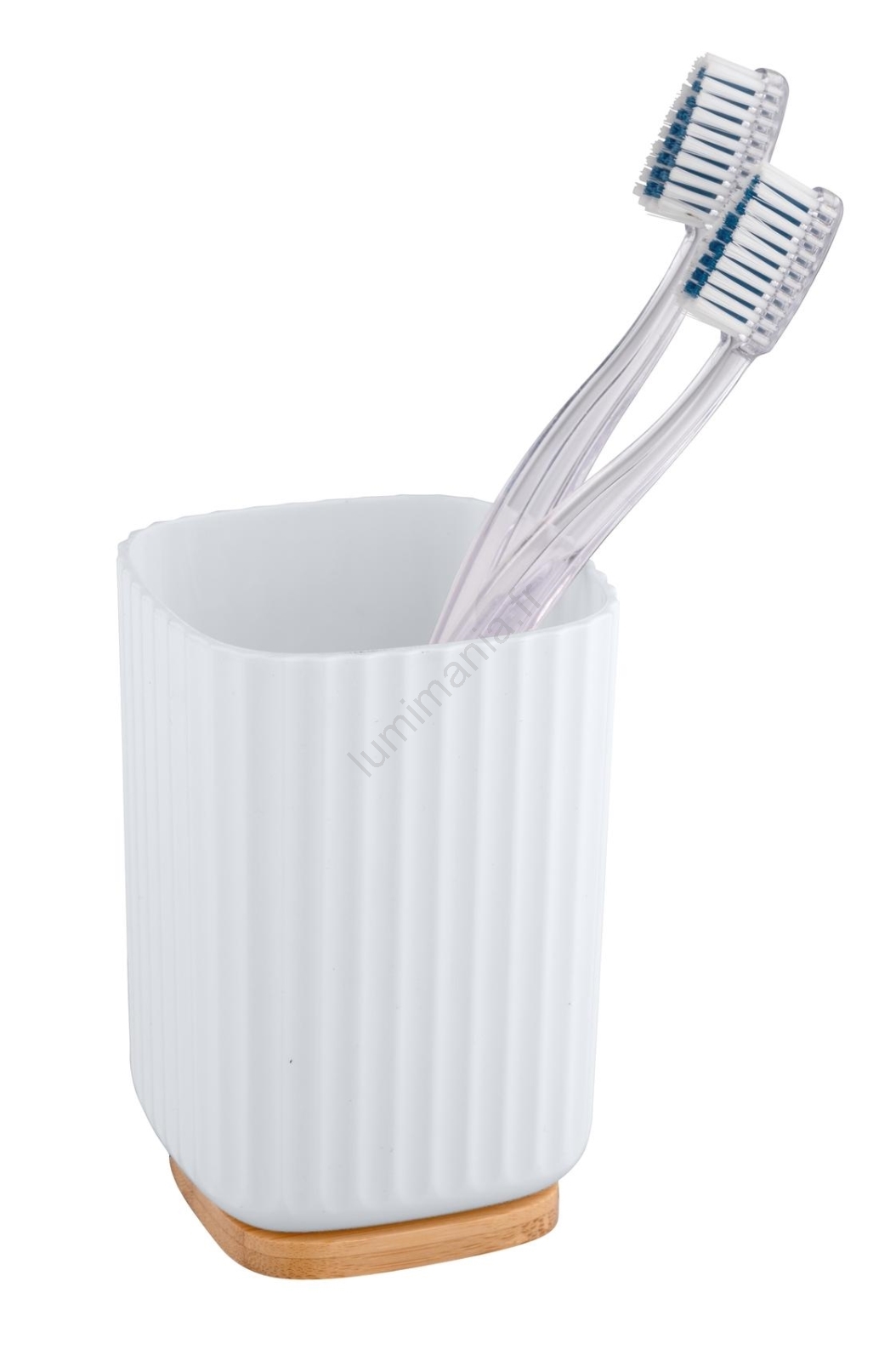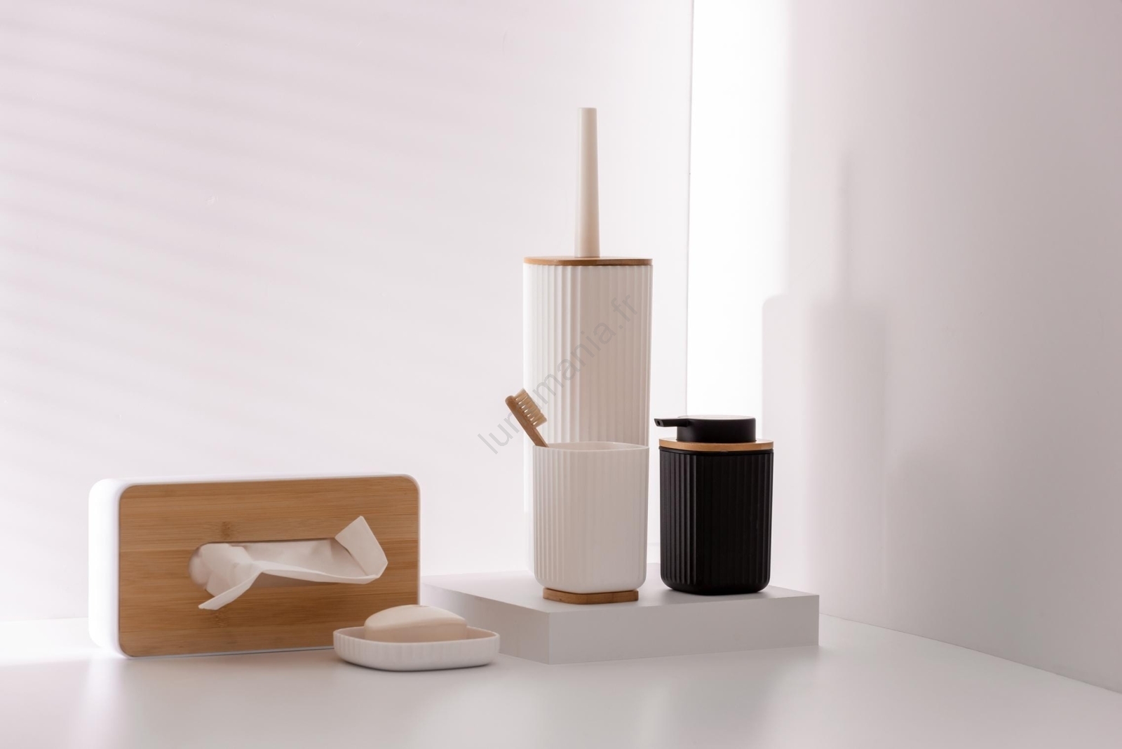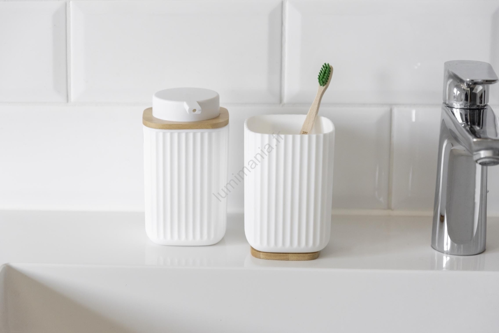 • Gobelet élégant pour brosses à dents au design moderne blanc, doté d'une base en bambou.
