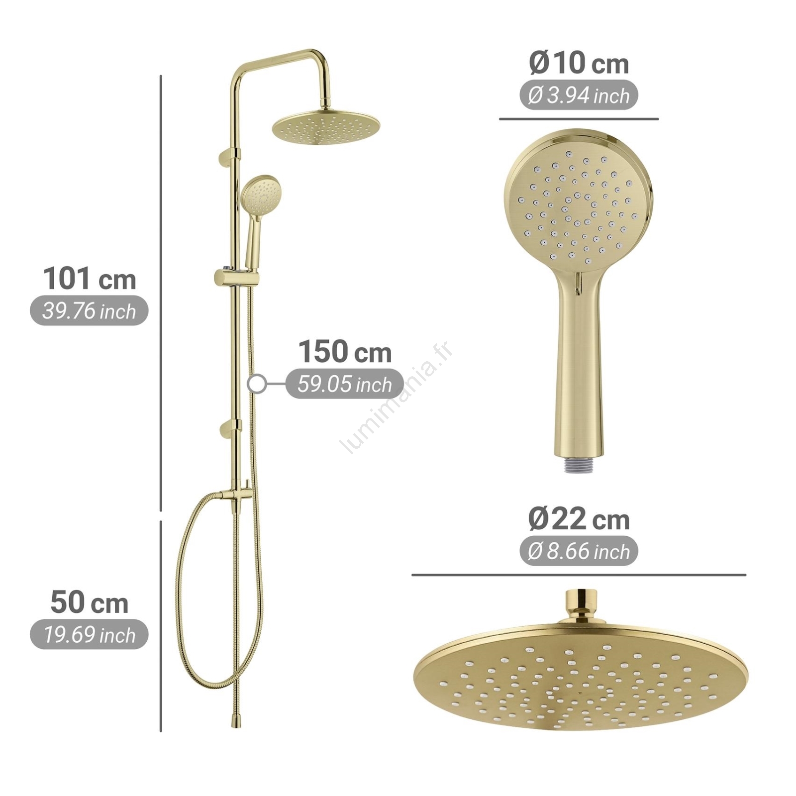 • Système de douche de luxe finition dorée pour une salle de bains élégante.