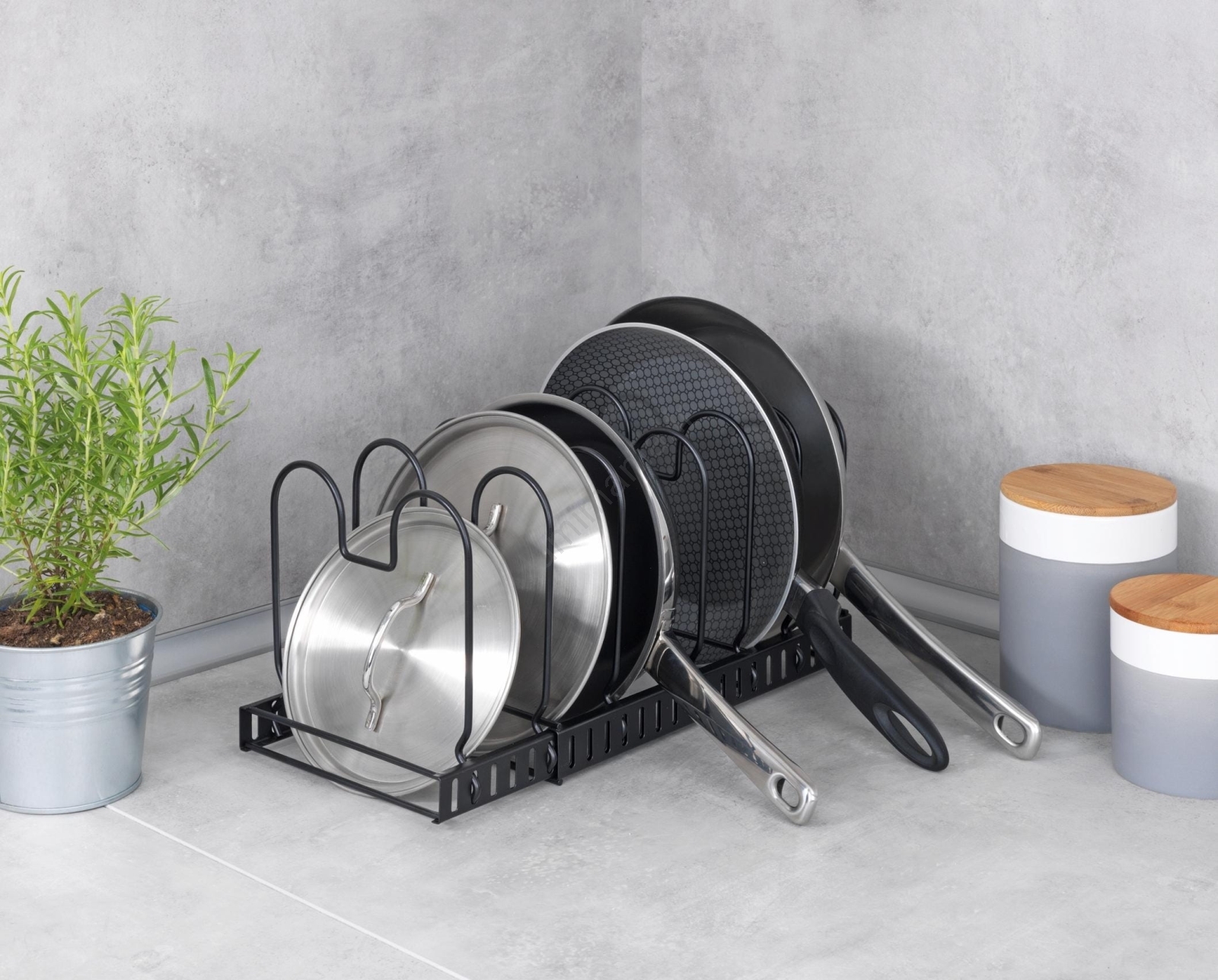 • Support élégant pour couvercles et poêles au design industriel moderne.