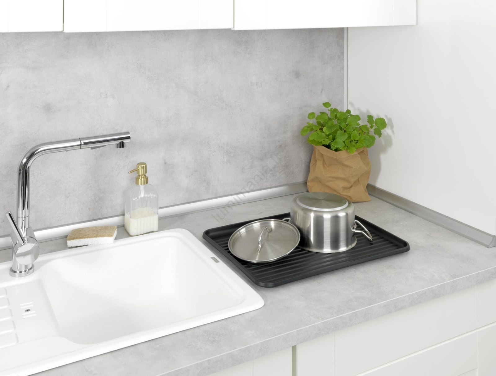 • Bac d'égouttage amovible en plastique recyclé recueille l'eau et protège le plan de travail.