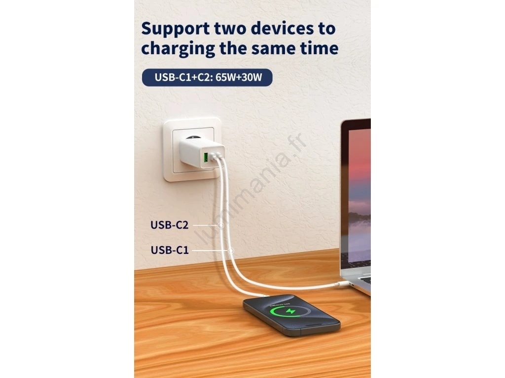 • La combinaison de 2× USB-C et d'un USB-A permet de charger plusieurs appareils simultanément, le chargeur répartissant intelligemment la puissance.