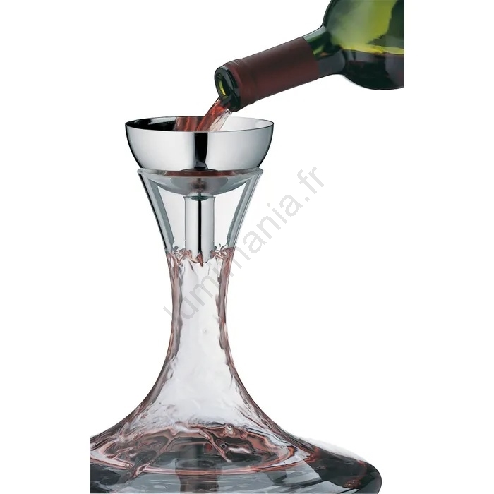• De fines ouvertures sur la partie de sortie de l'entonnoir (fond) répartissent le vin sur toute la paroi intérieure de la carafe et maximisent ainsi la surface de contact du vin avec l'air, ce qui permet une aération rapide et optimale et le développement de son bouquet caractéristique.